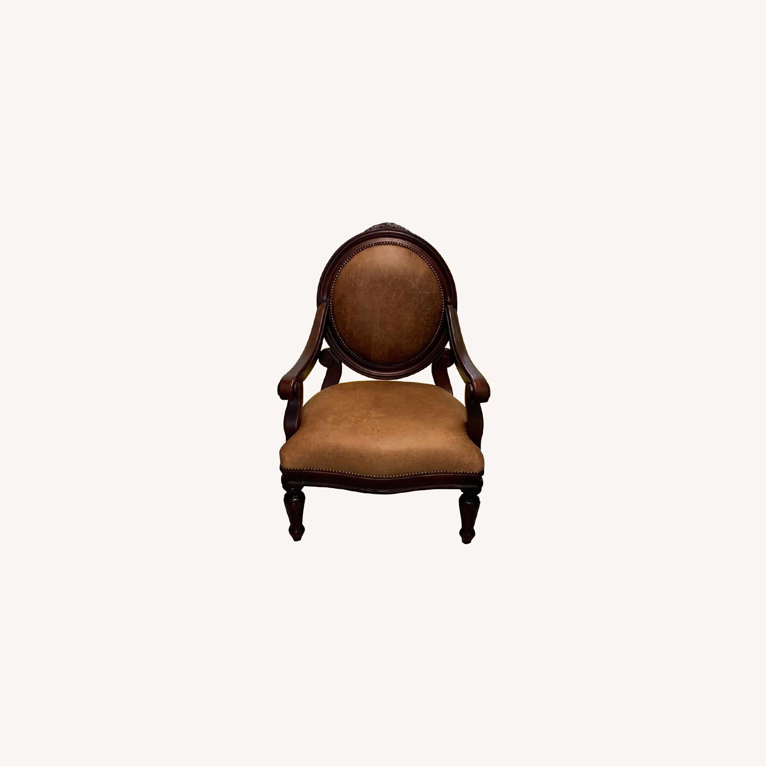 Seller's Notes:This is a classical armchair of leather and wood. A piece which catches visitors sight the moment they enter your living room.