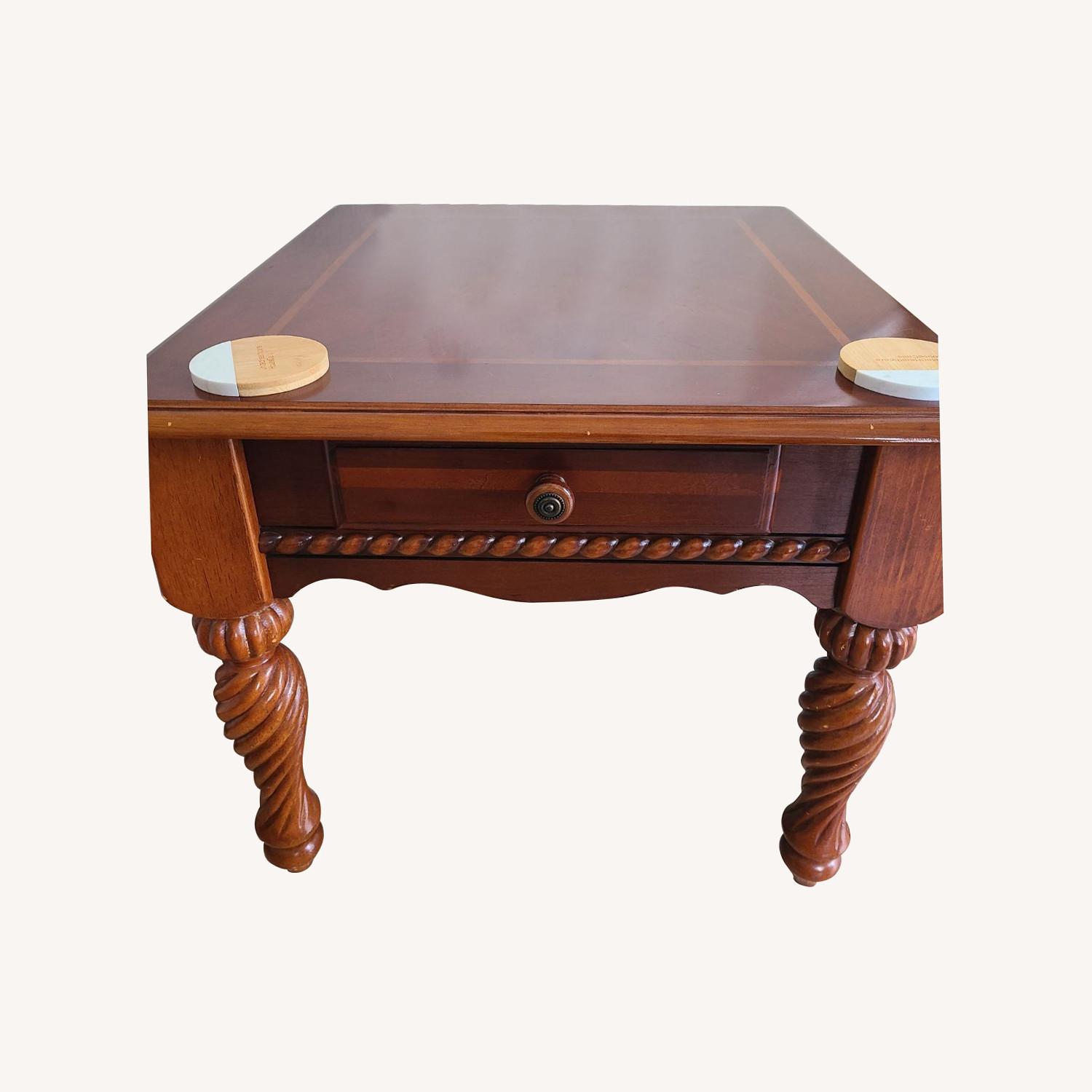 Seller's Notes:Classic traditional mahogany wood end tables. Defined by elegantly cinched detail plus an understated rubberwood end table with storage lends a touch of simple sophistication to any space. Two tables each $499 Crystal decorations not included!!