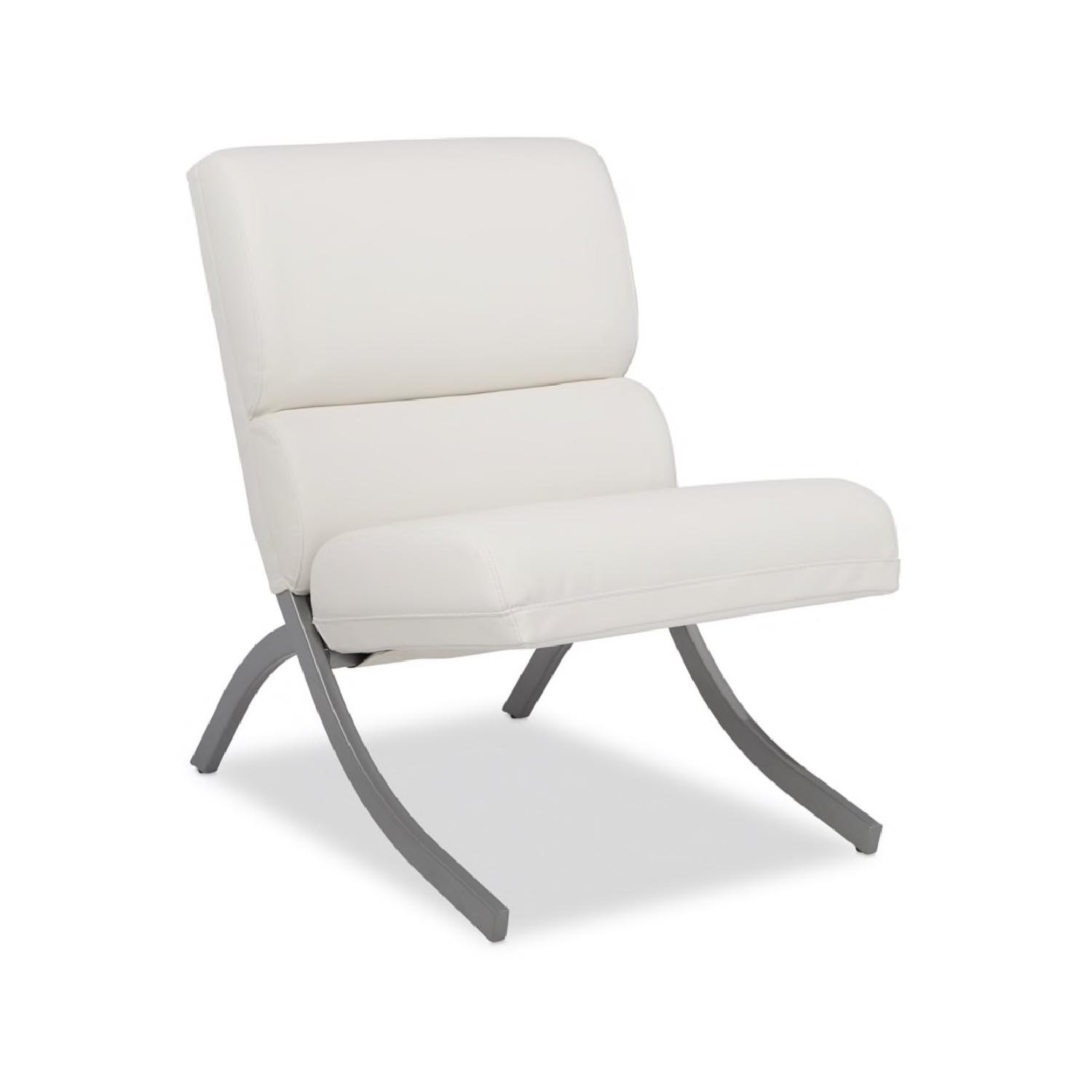 Seller's Notes:We’ve had this chair for several years but it’s in great shape. Description Sleek, sumptuous, and sturdy, this elegant chair brings an element of grace and luxury to your home. The crisp white bonded leather is supported by a durable metal base finished in brushed silver for a regal touch you can enjoy year after year. Features: White bonded leather upholstery Foam upholstery fill Brushed silver metal legs and frame Non-mar foot glides Dimensions: Seat: 23.5 inches wide x 18 inches deep x 19 inches high Chair: 34.5 inches high x 23.5 inches wide x 34.5 inches deep