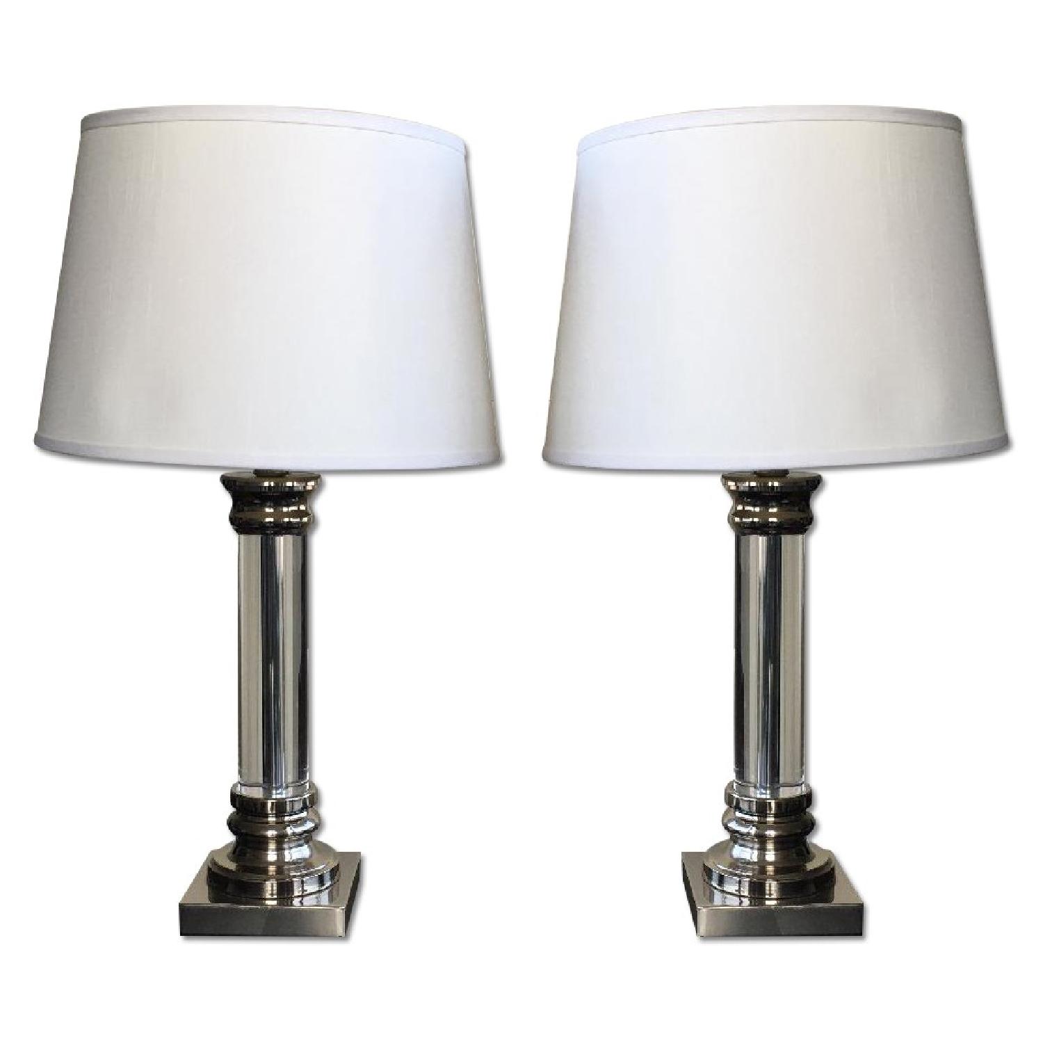 Seller's Notes:Set of two cylinder table lamps. Lamp bases and hardware are silver metal, cylinder lamp bodies are acrylic, and shades are white linen. The shades are 14.5 inches circular and lamp base plus shade is 25.5 inches high. I hate to part with these, but I'm moving to an apartment with in-ceiling lighting.