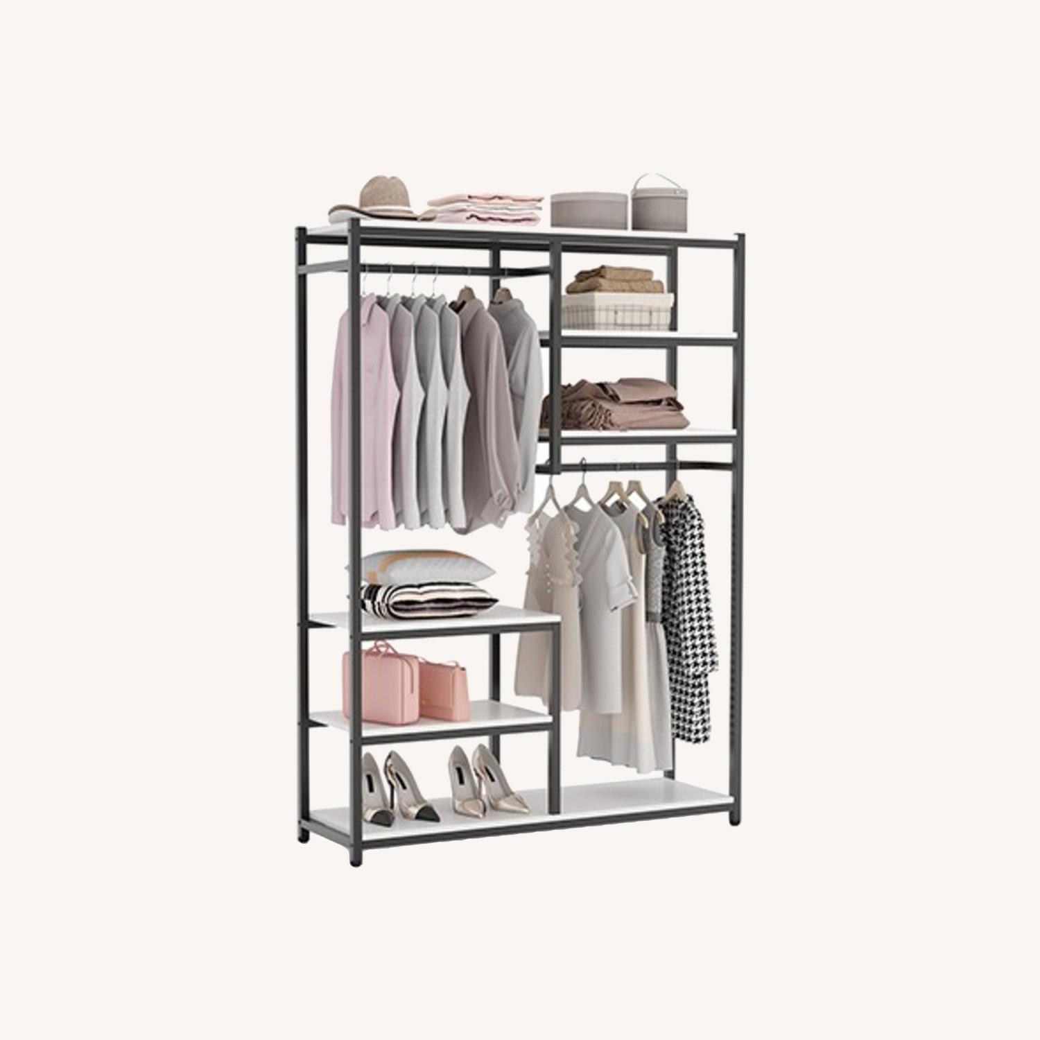 Seller's Notes:Tribesigns 47" Free-standing Closet Organzier, Double Hanging Rod Clothes Garment Racks with Storage Shelvels, Heavy Duty Metal Closet Clothing Shelving,Capacity 400 lbs https://www.amazon.com/dp/B09F2ZTJLD?ref=ppx_pop_mob_ap_share&th=1 Color White&black Brand Tribesigns Shape Rectangular Item Dimensions LxWxH 47 x 15.7 x 70.7 inches