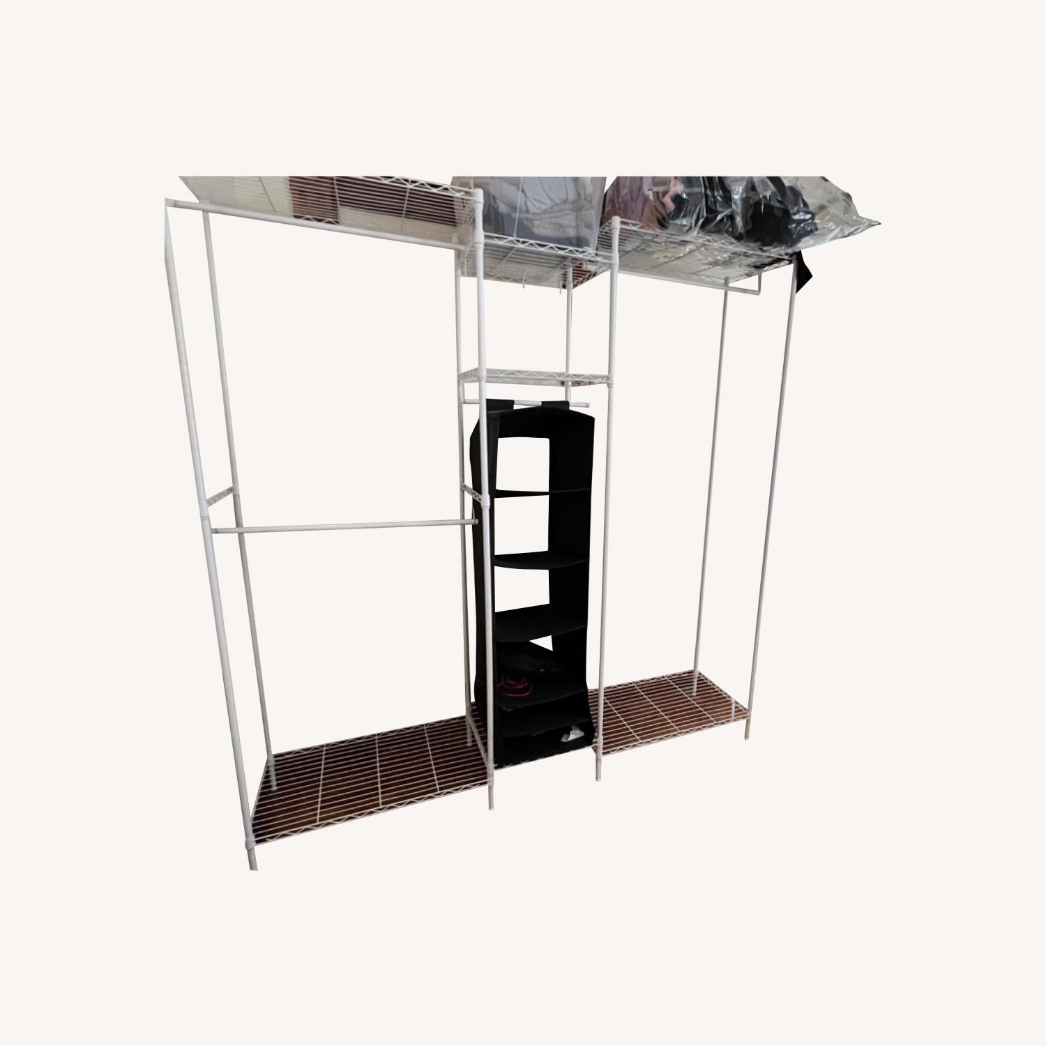 Seller's Notes:Wire garment rack 5 tires heavy duty clothes rack for hanging clothes, wardrobe rack compact large metal clothing rack, max load 780lbs Including a black hanging closet organizer and a small white clothe rack from ikea