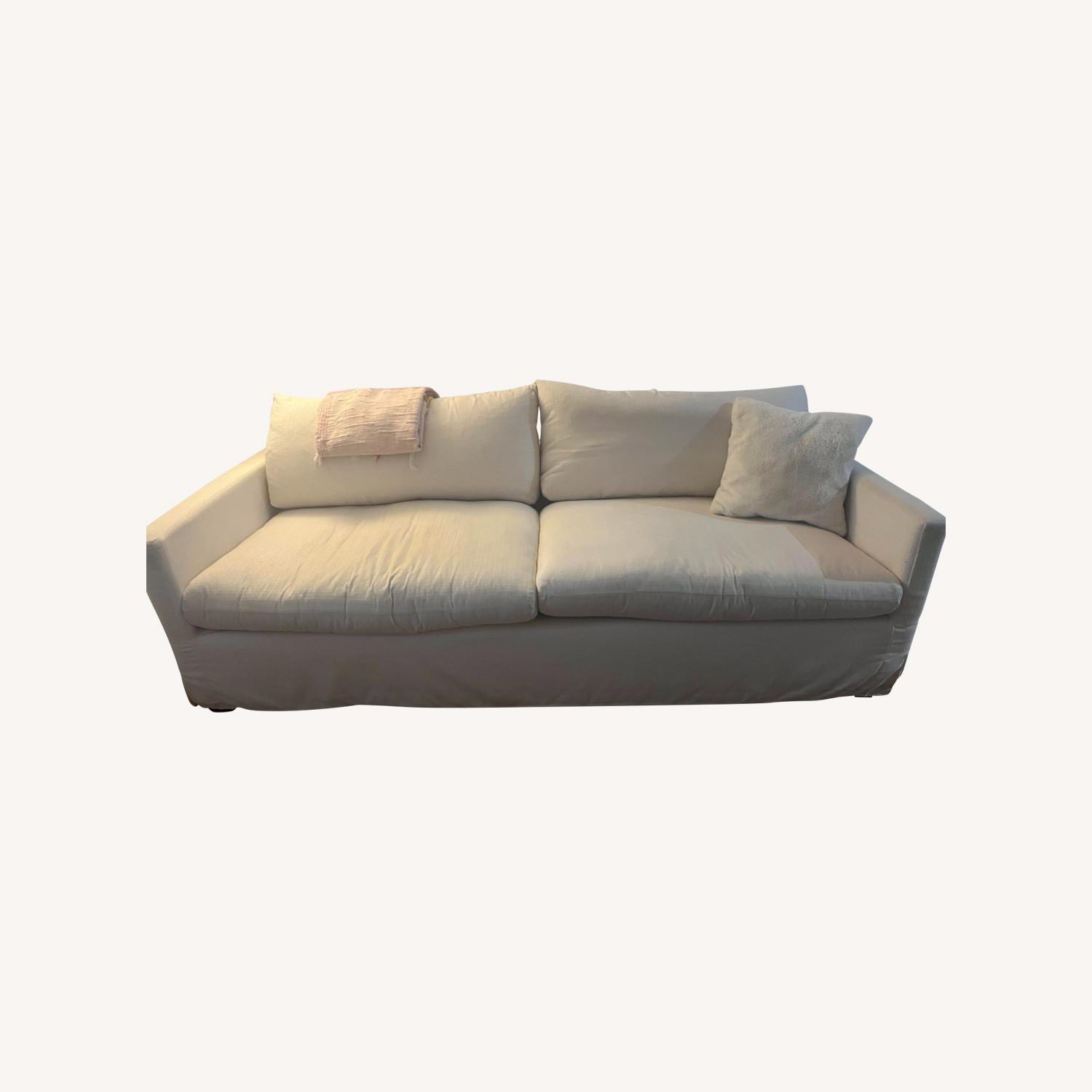 Seller's Notes:Fabric-lined and feather-filled cloud couch dupe! Purchased last year brand new for $1200. Lining is ripped underneath the couch but it's not visible nor will it affect the structure of the couch. Perfect for small apartments and incredibly comfy! Crafted of solid pine wood frame with polyester-nylon performance upholstery, feather filling and rubberwood feet with espresso finish. Removable and reversible cushions