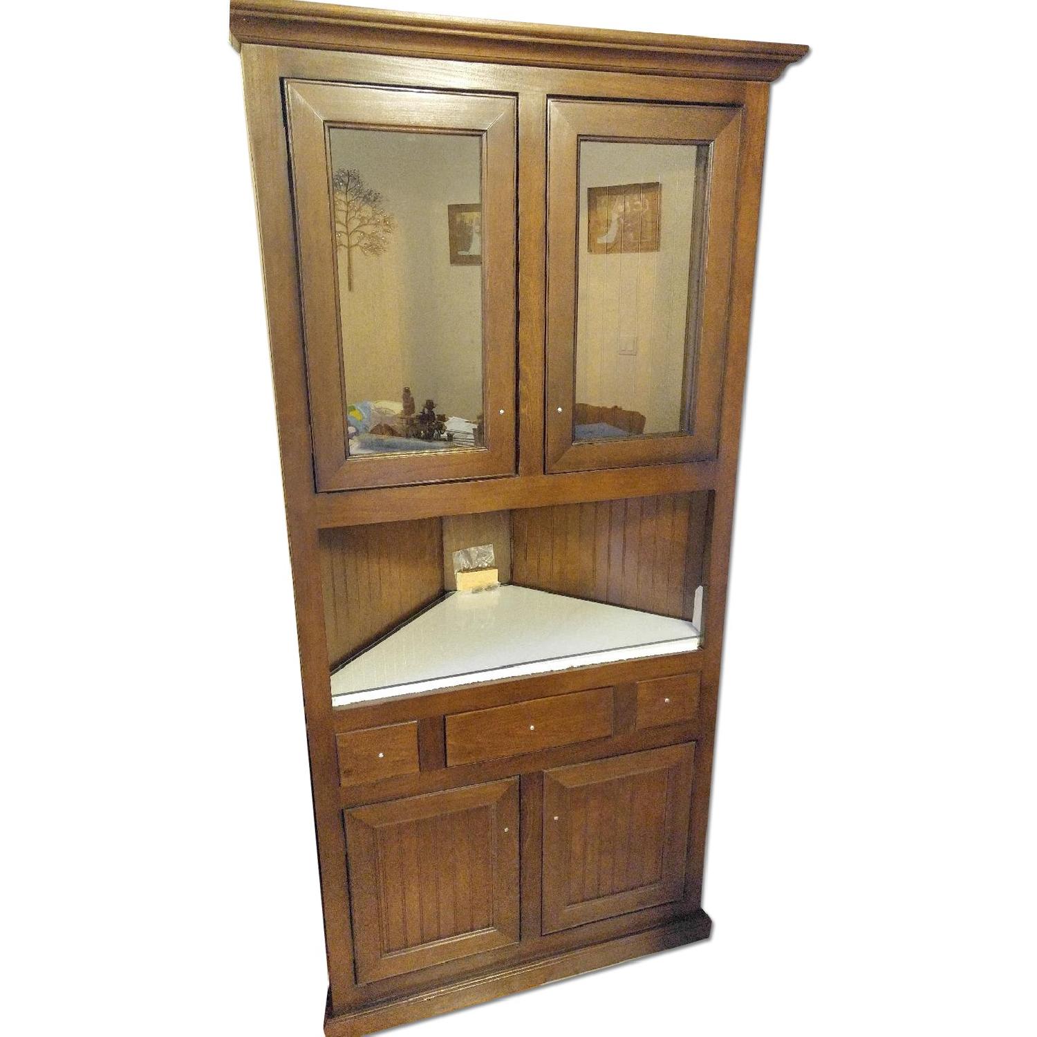 Seller's Notes:Brand new, unassembled. The glass shelf is still held in place by the packaging and the hardware finishes have not been attached yet. We are selling it because it is not the correct size for our apartment. Coastal Corner Dining Buffet with Hutch. Recessed doors, beadboard panels and solid wood moldings provide a clean, contemporary style that is complemented by the chocolate mousse stained finish. 2 glass panel doors 1 adjustable glass shelf 1 Top Light 1 drawer 2 beadboard doors Corner Out: 27.5-in Materials: Birch Wood / Glass Buffet Storage: Cabinets, Drawers, Shelves China Cabinet Design: Corner China Cabinet Features: Glass Doors, Lighting Stain: Chocolate Mousse