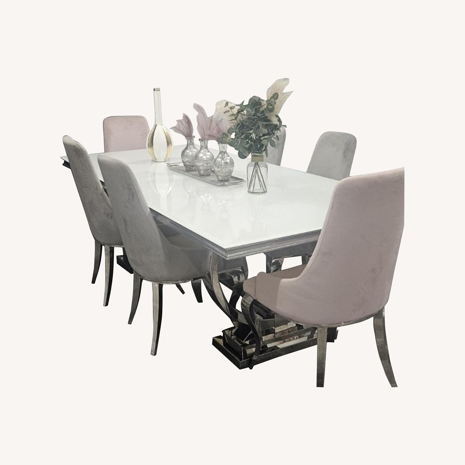 Seller's Notes:Coaster 108811-7PC 7 pc Sharli antoine chrome metal base dining table set with white glass top grey or light pink chairs. This set includes the table with 6 - side chairs. Table measures 94.5" x 42" x 30" H. Chairs measure 22" x 24.5" H 39"H. Chairs come in grey or Light pink velvet fabric.