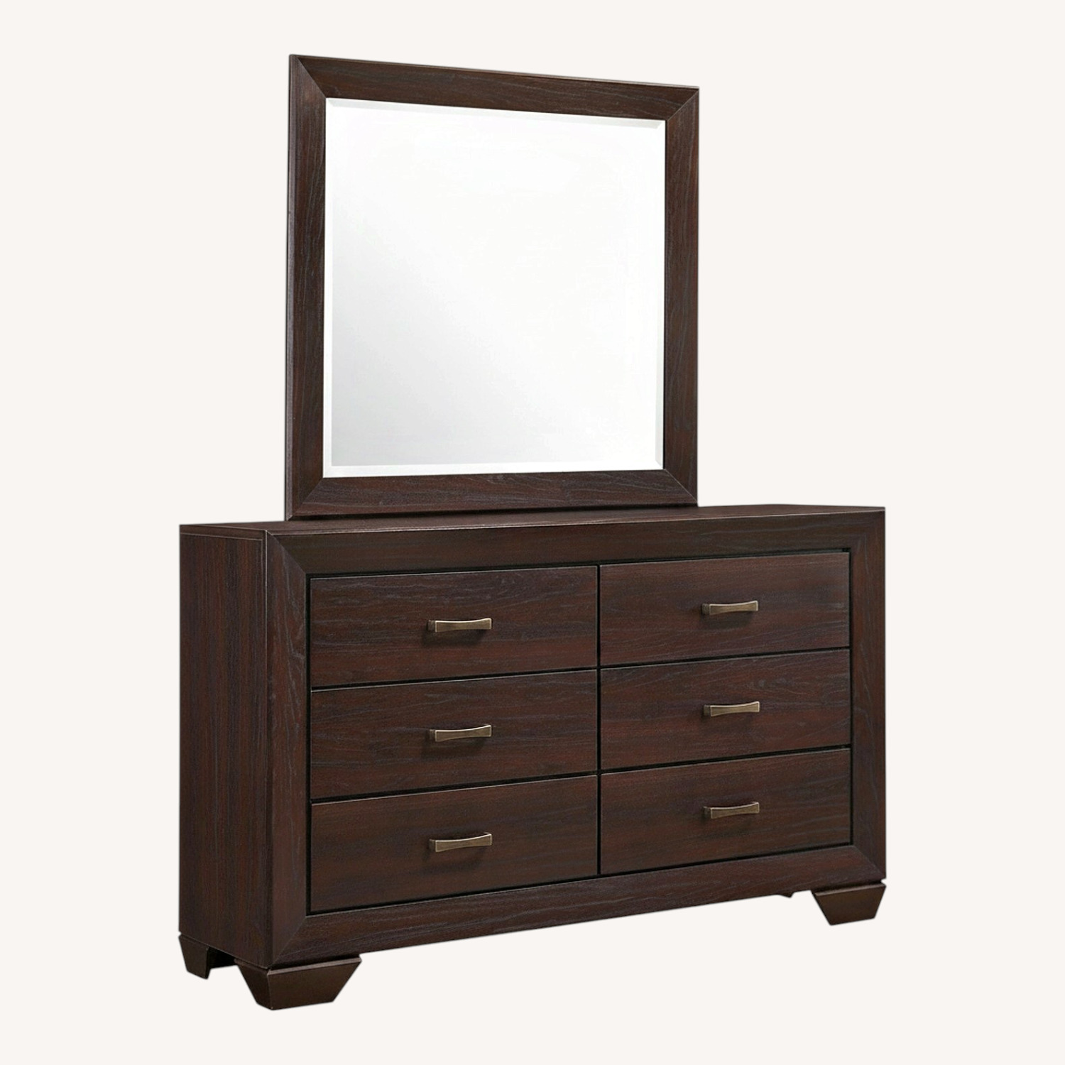 Seller's Notes:Infuse your bedroom with the transitional style of this dresser, where straight, squared lines create a robust silhouette. The rich, dark cocoa finish, accented with black recessed grooves, provides a striking contrast, while sleek bar-style drawer pulls add a touch of glamour. With six spacious drawers, this dresser organizes your space with sophistication. The matching square mirror, with its clean lines and slightly exposed wood grain in a dark cocoa finish, warms your space and creates a sleek focal point, whether placed above a dresser or on its own.