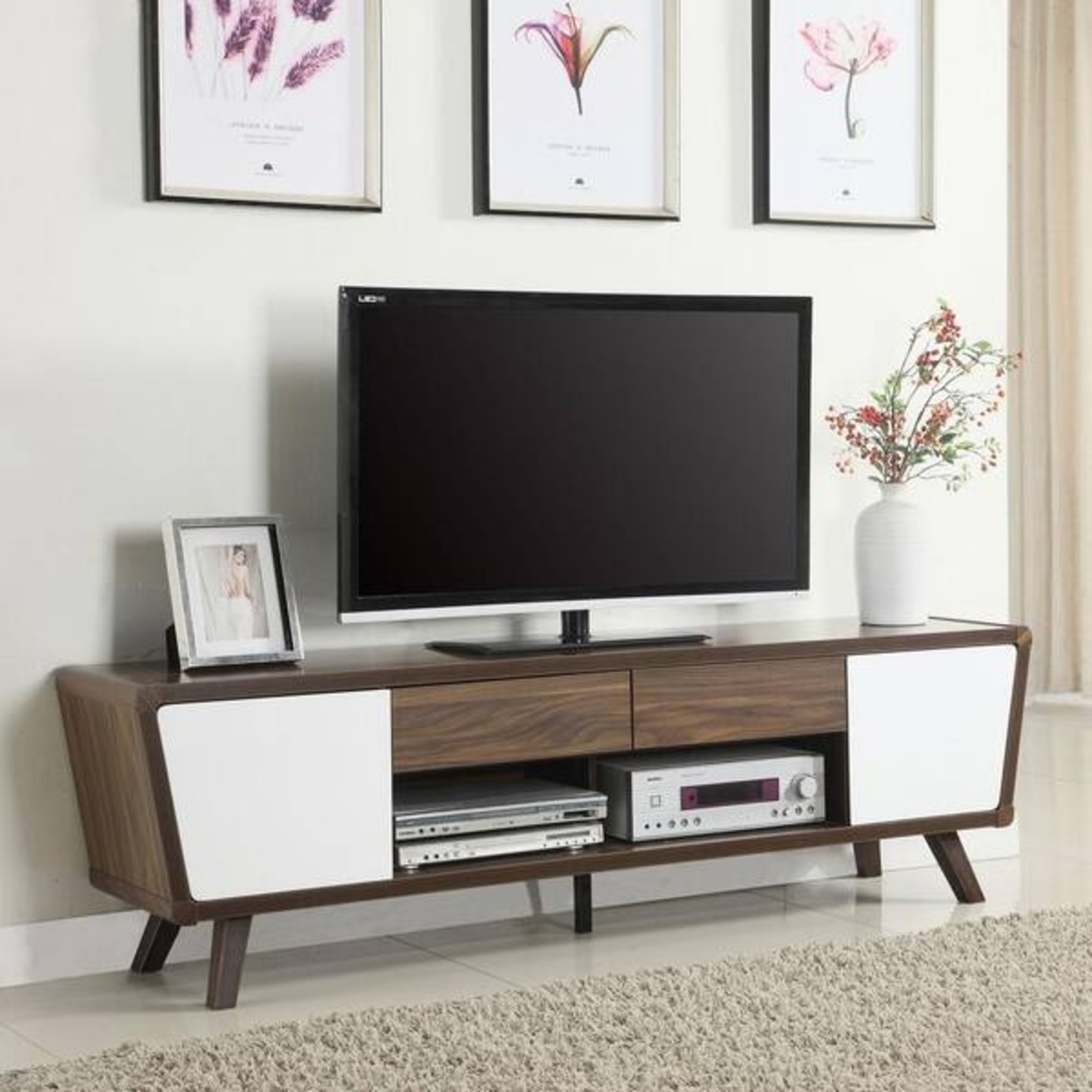 Feast your eyes on a retro gem. Borrowing heavily from mid-century modern design, this TV console offers a stylish, charming look. Revisit the 1960s with 21st century technology, enjoying space for a large-screen television, components, and media. A glossy white and chestnut finish provides a nice mixed palette with a fresh attitude. Make this TV console part of a festive retro design space. Highlights Includes: One (1) TV stand Material: MDF, Oak, Particle Board Finish color: Dark Walnut TV console finished in walnut with door fronts finished in glossy white Features two (2) storage drawers, and two doors with a total of four (4) storage compartments Euro drawer glides Max TV size: 80 in. Number of drawers: 2 Number of doors: 2 Drawer structure: Screw drawer construction Number of compartments: 4 Product Dimensions: 74" W x 15.5" D x 21.5" H