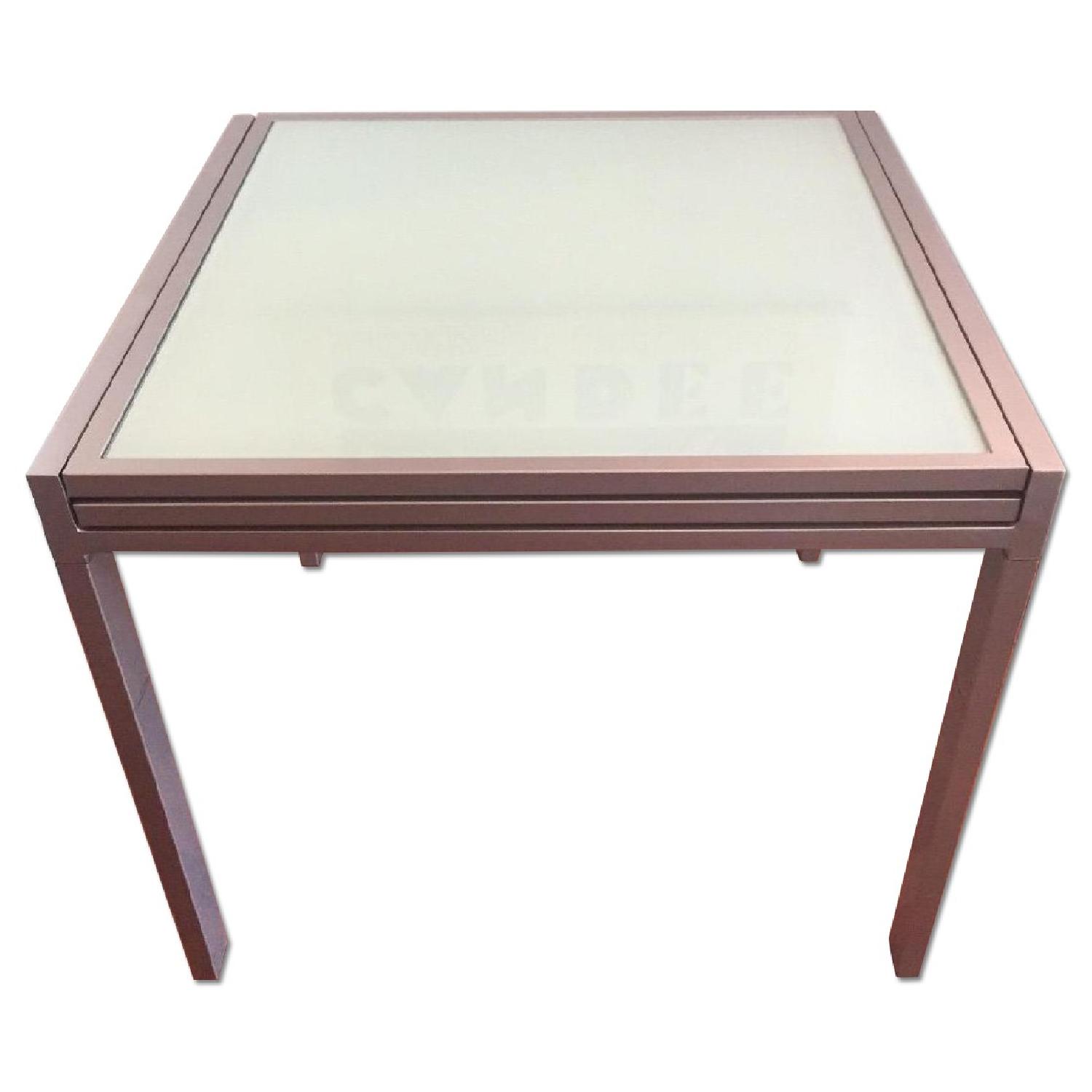 Seller's Notes:Coaster Company of America aka Coaster Fine Furniture dining table expandable to 71 inches (picture above.) The tempered frosted glass clean defined edges and bold straight legs in a pearl Finish compose a sophisticated appeal. The metal extensions adjust the table from a square to a rectangle extending the length from 35.5 inches to 71 inches. Arrange with chic dining side chairs for a stylish and enjoyable dining atmosphere. Group Style: Contemporary Ideal for moderate size rooms Table Base: Metal Extension Leaf