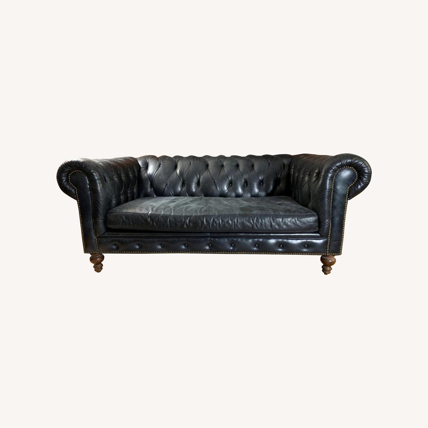 Seller's Notes:Extremely comfortable vintage Chesterfield style real leather loveseat with down bench cushion, walnut feet, and lots of character. Was originally a custom order from Roger+Chris, and made by COCOCO in North Carolina. Some of the tufting on the back is coming loose, but can be easily repaired at home (see this video tutorial: https://youtu.be/vlntWuUD0ps). Leather has slight distressed appearance that is by design how the appearance is meant to change with use as part of its vintage-looking character, and can be maintained with regular leather conditioning.