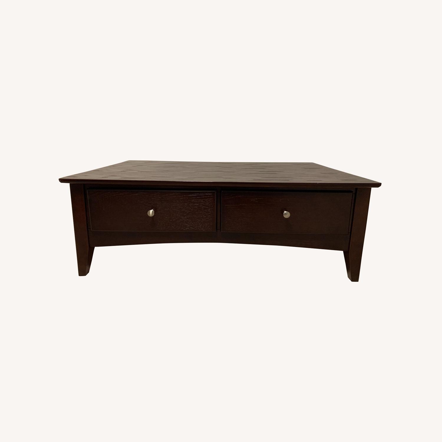 Seller's Notes:A coffee table with two drawers. Has blemishes around the wooden frame, but in good overall condition.