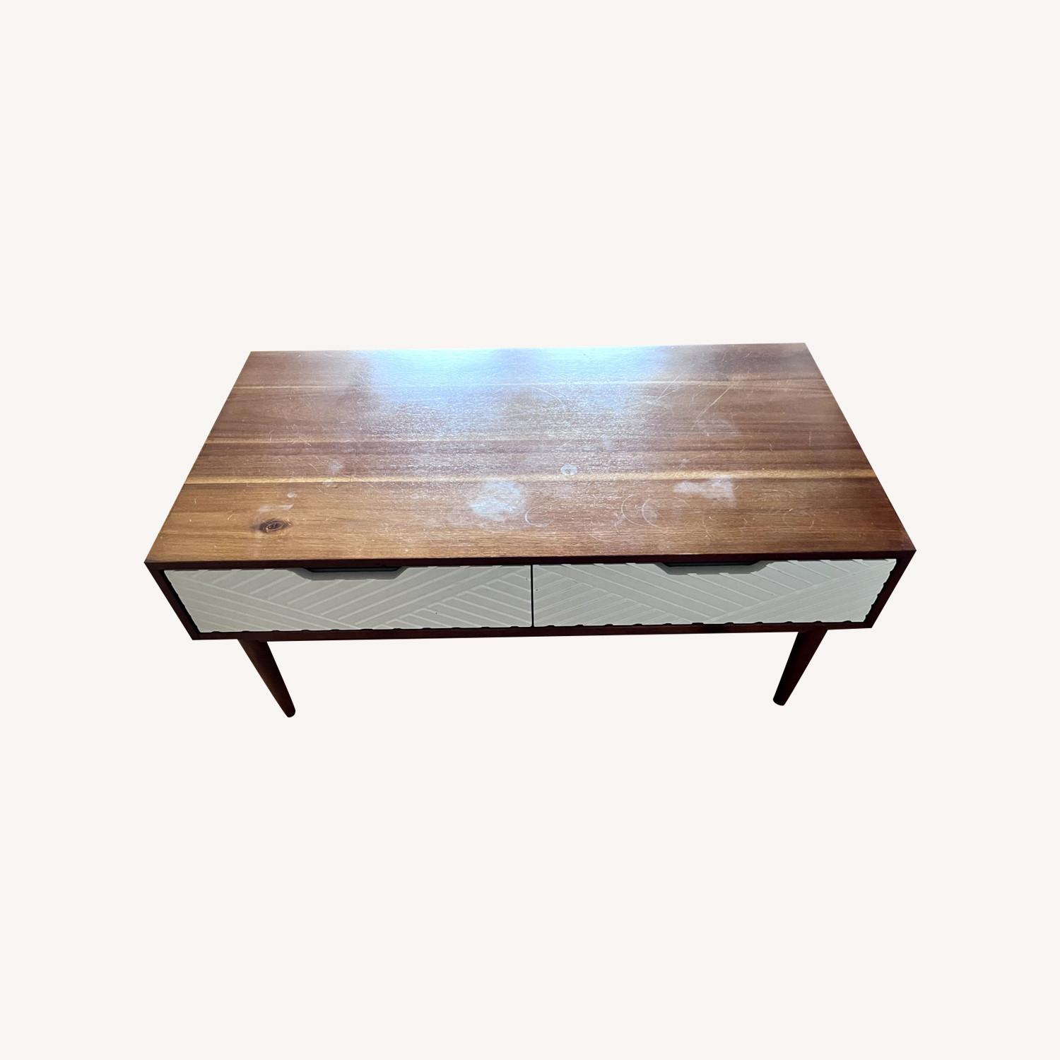 Seller's Notes:Coffee table with two drawers, have used for three years. Some light scratches and stains on the surface, otherwise great condition. Super sturdy construction and nice wood. If picking up, the table is quite heavy and will need two people.
