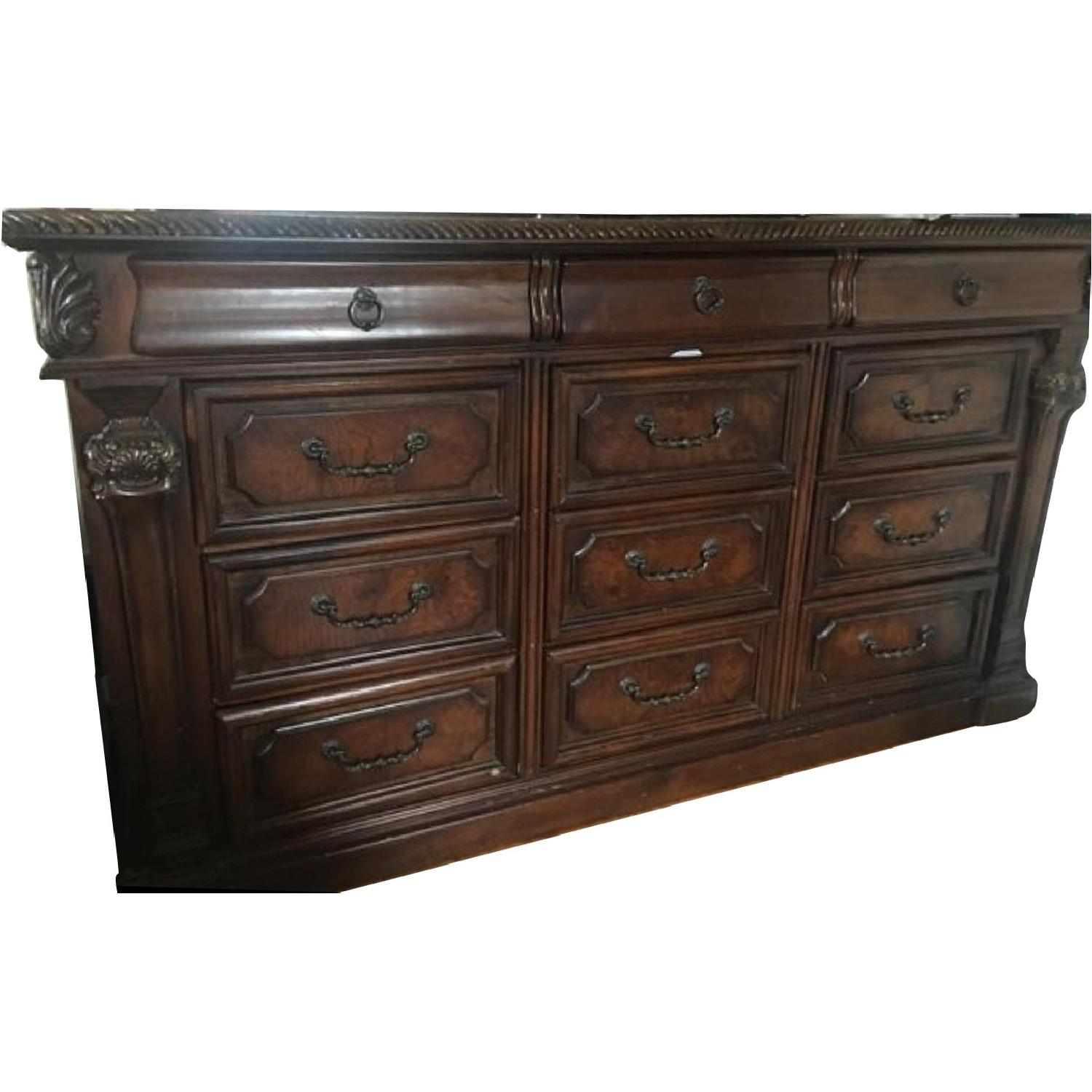 Seller's Notes:Collezione Europa, very spacious dresser with 12 drawers. Beautiful cherry finish. Mirror can be placed in the center or on either side of the dresser. Regular wear and tear with some minor stains and scratches due to previous move. One of the drawers' rail needs to be readjusted. Selling due to long distance move and because I no longer own the bed frame that came with the set.