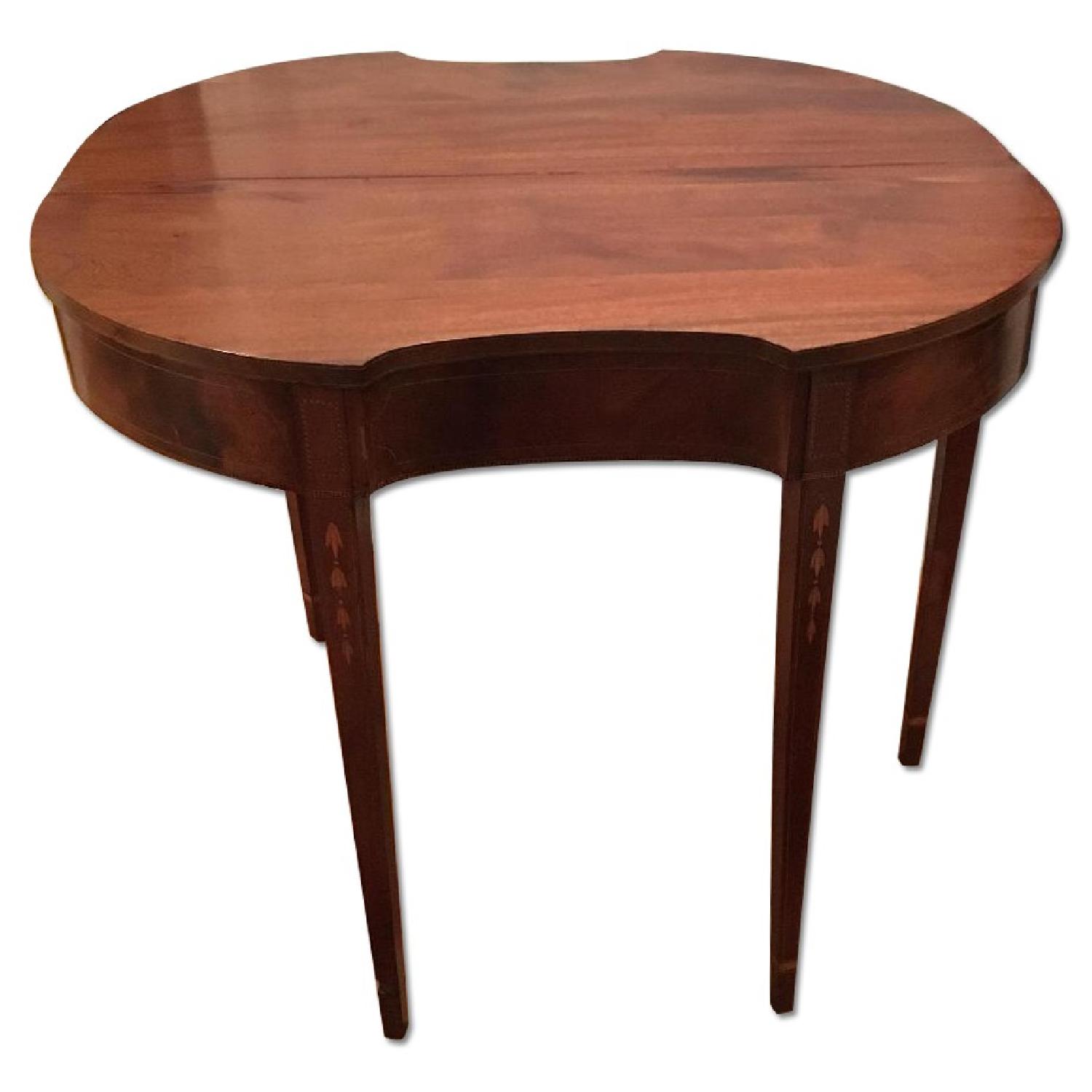 Seller's Notes:What's great about this table is that it's foldable. I had it in half against a wall. I bought this while in Mystic Connecticut. The woman told me it was at least 100+ old. It's definitely a colonial style. I don't see any signature. There is a small piece of inlay work missing from one of the legs. I forgot about it until I took a picture, so that's how noticeable it is. I would consider this table an antique and there for it has been loved/worn for several generations