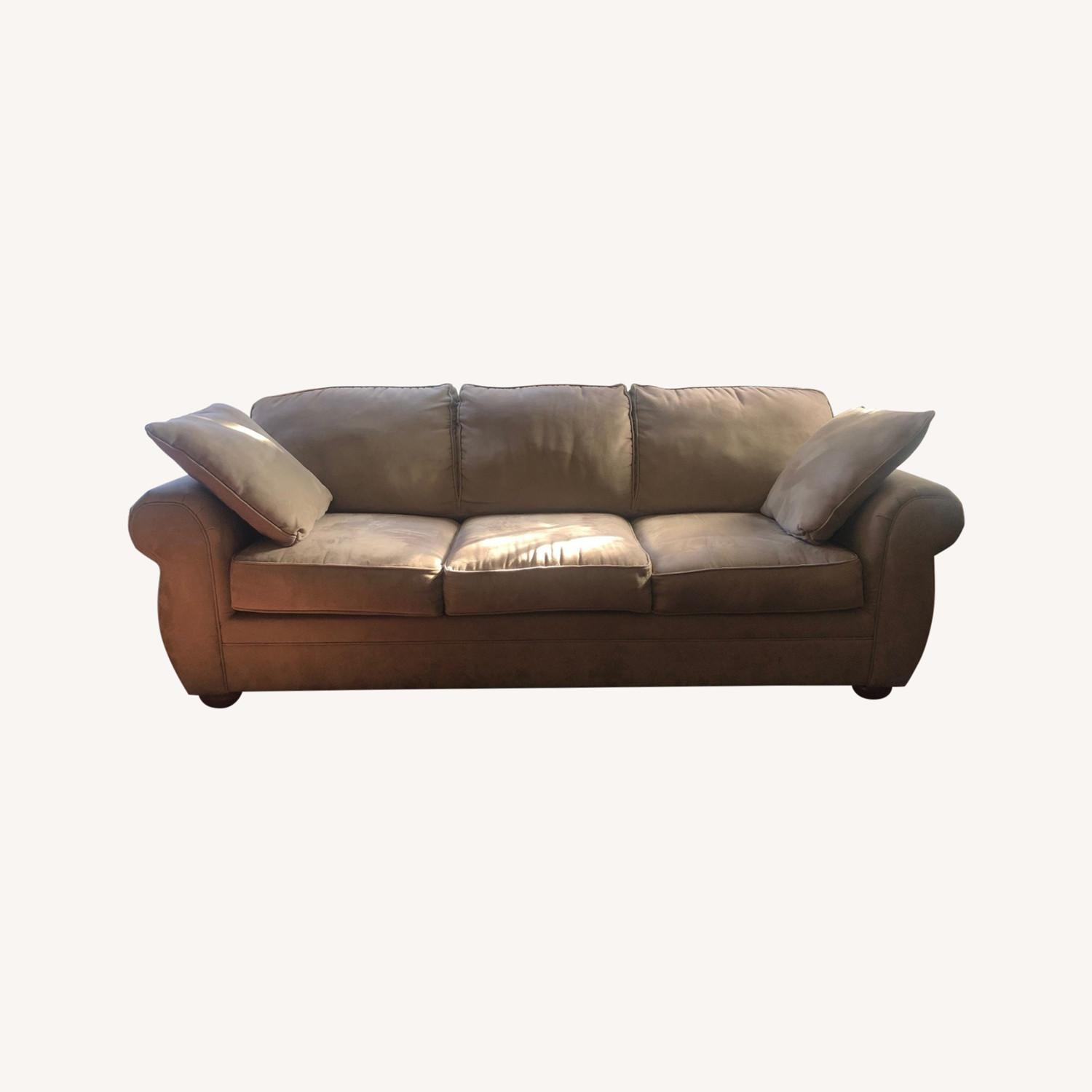 Seller's Notes:Very comfortable robust, high-quality microfiber upholstered sleeper sofa (queen size) in a versatile neutral color. Removable cushions, wood feet.