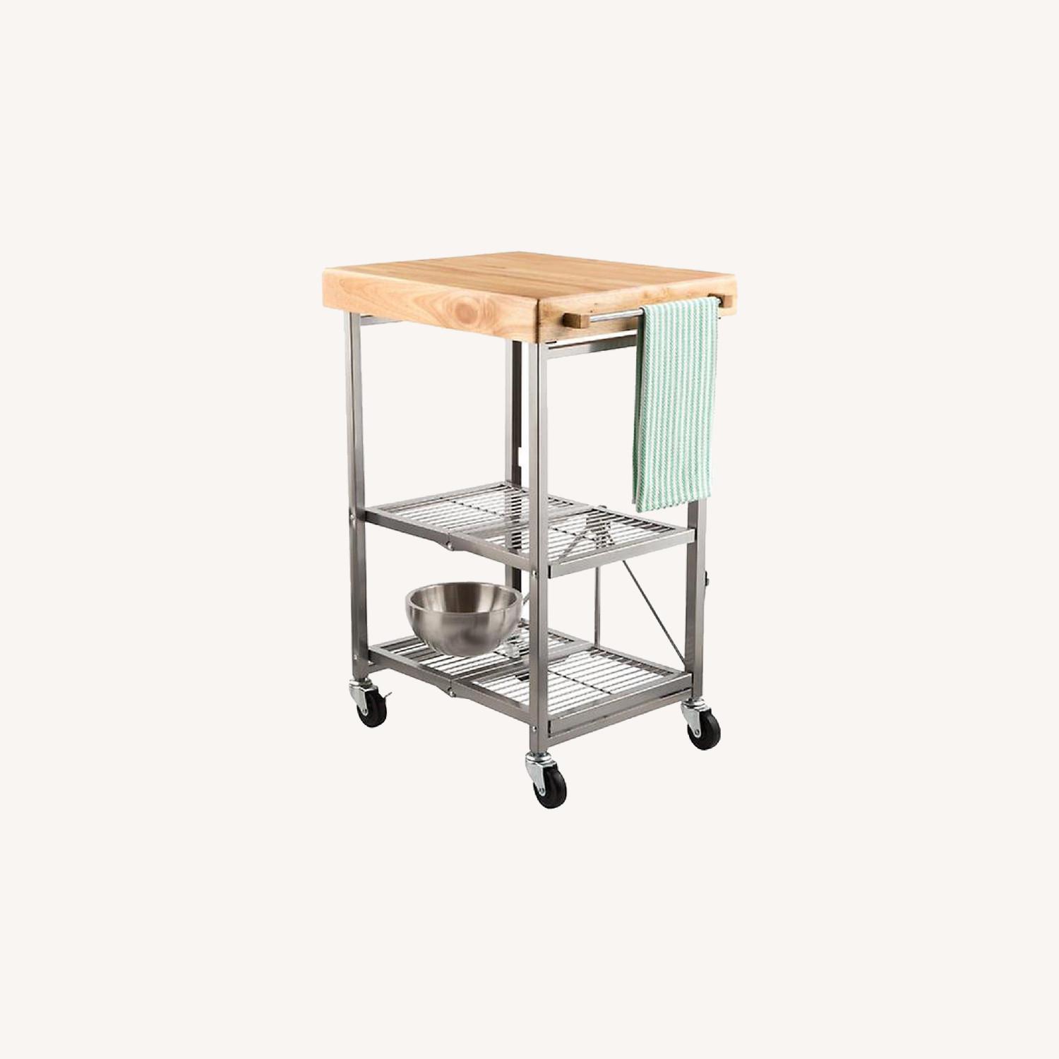 Seller's Notes:This item has some scratches on the top wooden block but you have to look closely too see them (included photo). Still works great, and is convenient for apartment living (folds up), I just no longer have use for it. This versatile cart is made of rubber wood and a sturdy steel frame featuring four caster wheels that easily rolls to wherever you need it. It also provides a built-in prep surface with two additional shelves for easy storing and transport and folds to just 6" wide so it can easily be store neatly away when not in use. Weight capacity is 100 pounds for the top shelf and 50 pounds for middle and bottom shelves. Prep-surface is made of rubber wood Two shelves provide additional storage Casters provide an instant, mobile island Folds to just 6" when not in use