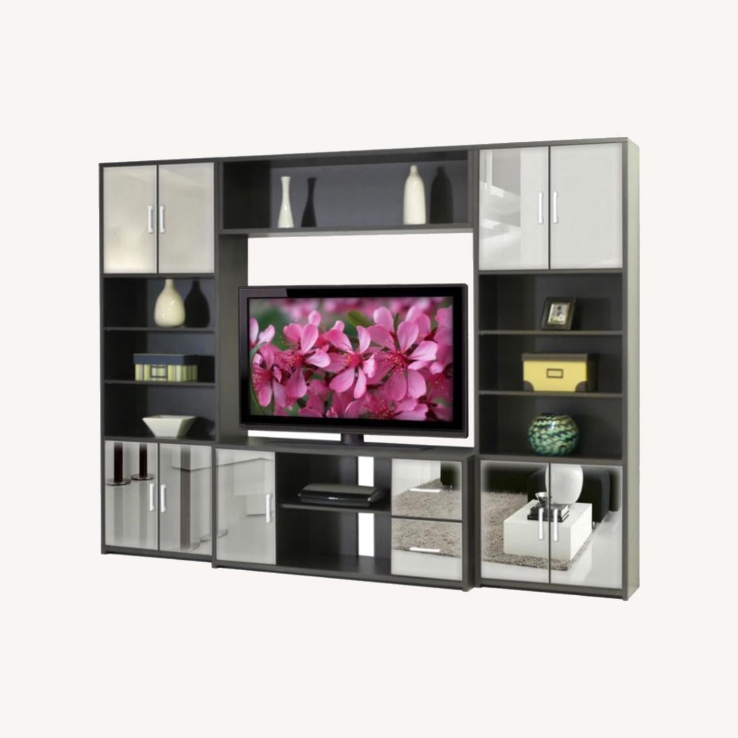 Seller's Notes:The transitional styling of the Stockton entertainment center is designed to fit well in traditional and contemporary spaces alike. Plenty of discreet storage is coupled with well balanced open space for display within this modular four piece unit. Single bridge and wide, adjustable shelves give this entertainment center a refreshing, open appearance that will be enjoyed throughout your living room. It's easy to connect and access the wires and cables for your electronics with the opening behind the component shelves. As we are known to do, we have included plenty of different storage areas for media, remotes and all the other stuff that people like to keep in the living room (but don't necessarily want to look at all the time). Doors, drawers and shelves-- the Stockton has it all! Dimensions1 111.5″W x 18″D x 84.5″H TV Cavity: 54"W x 43.25"H x 18"D