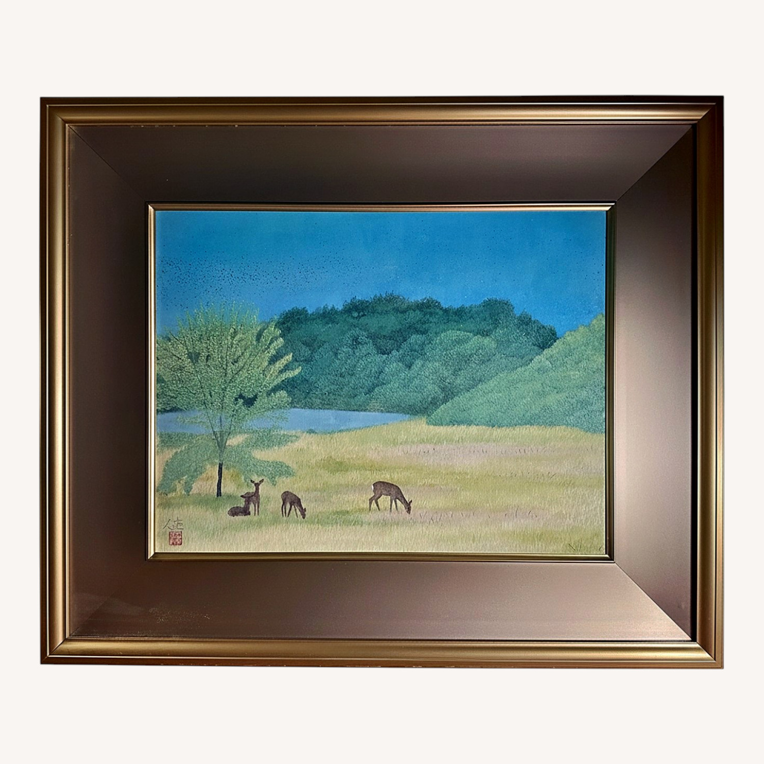 Seller's Notes:Oringinal paiting from Kyoto's famous artist Keiko Inokuma. Size 10P, Title: Morning in a forest Clear and complete provenance, oringail frame (artist's signuature in the back), original box(gallery's info on the side), original purchase receipt. purchased in Nov 2013 from Taigado Gallery, Kyoto. It has been in my home. This is nihonga, drawed with mineral pigments I never hang it at home, I put it on the table and lean against the wall. A defect on the frame, it got harmed during the transportation. You can see in the photo from both front and back. The painting itself is intact. Just the frame. Also, when I lift the frame, I feel some internal part of it is loose. It's hard to tell from external. I put as many details as I can in the photos