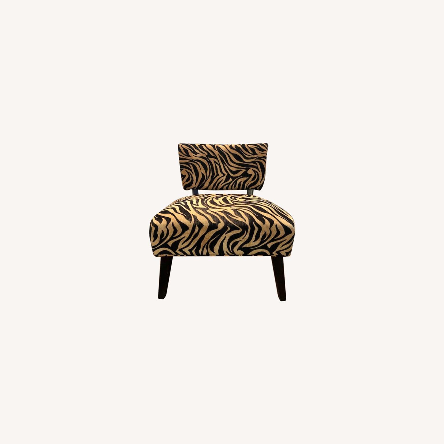 Seller's Notes:This is a fabulously comfy and stylish accent chair perfect for living room, reading nook or bedroom. I have had it covered with a throw the whole time I have owned it so it is in excellent condition. The fabric is plush with a velvet-like nap. Firm seat but not "hard"... "just right." Legs are wood. - Seat height measures 19.5 inches - Elegant furniture is built with a sturdy hardwood frame - Contemporary occasional chair enriches the look of any home decor - Chic chair features fabric upholstery with a modified zebra print - Spring seat construction - 11-step wood stain finish - Non-mar foot glides