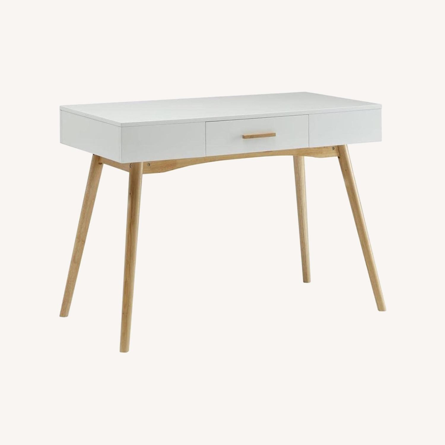 Seller's Notes:Fabulous writing desk that fits into small spaces. Simple mid-century modern style. It has one small blemish in the drawer and some small spots on the drawer interior (not visible when closed). Moving into a bigger home, and sad to part with it! Piano Finish Surface Solid Wood Legs Drawer For Concealed Storage with Bamboo It also provides drawer for concealed storage, paired with bamboo handle that will easily complement any room decor.