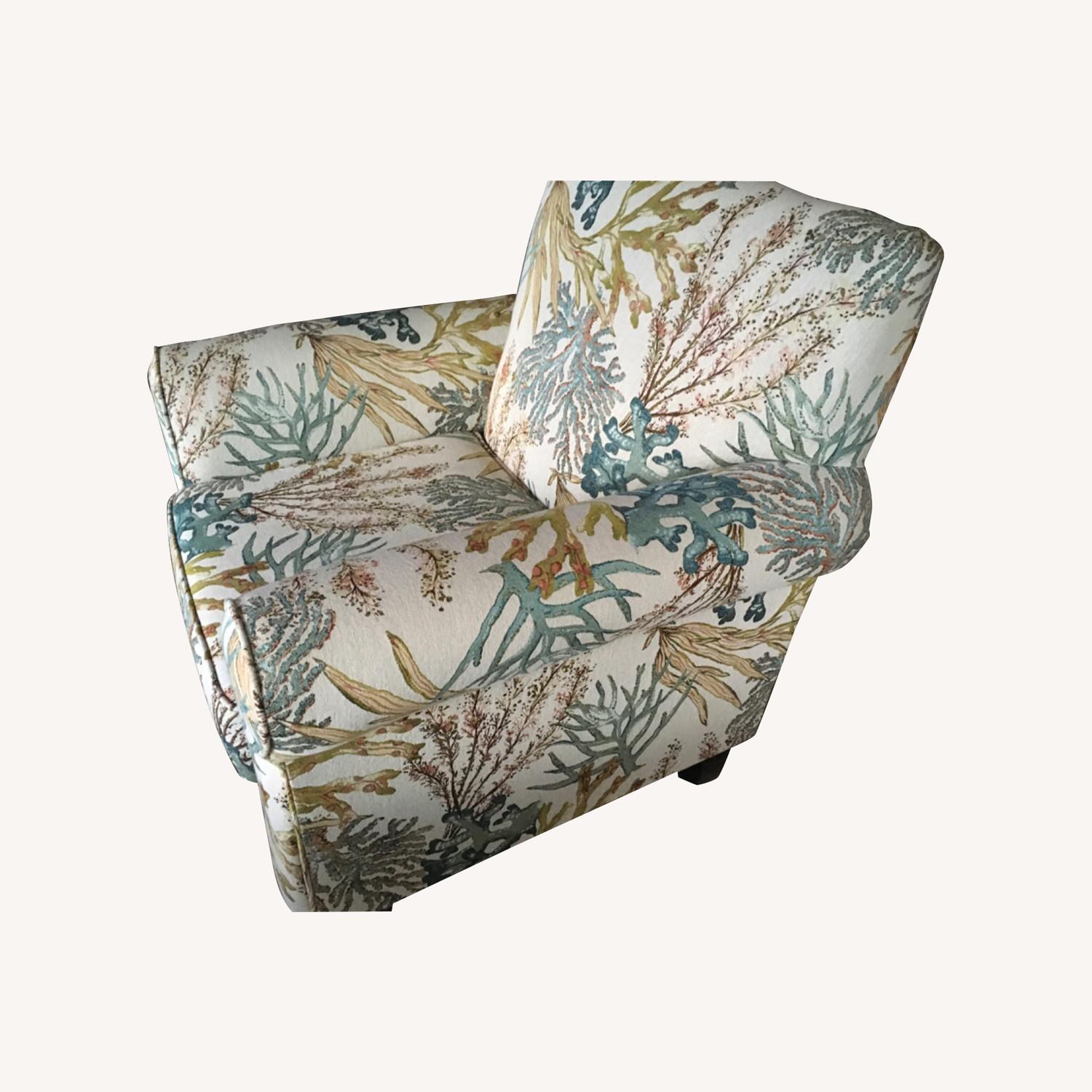 Seller's Notes:Accent chair with a lively print fabric. Chair is comfortable, with a box seat cushion and tight back cushion. Welt cord trim, tapered feet in a dark wood finish. Excellent condition.