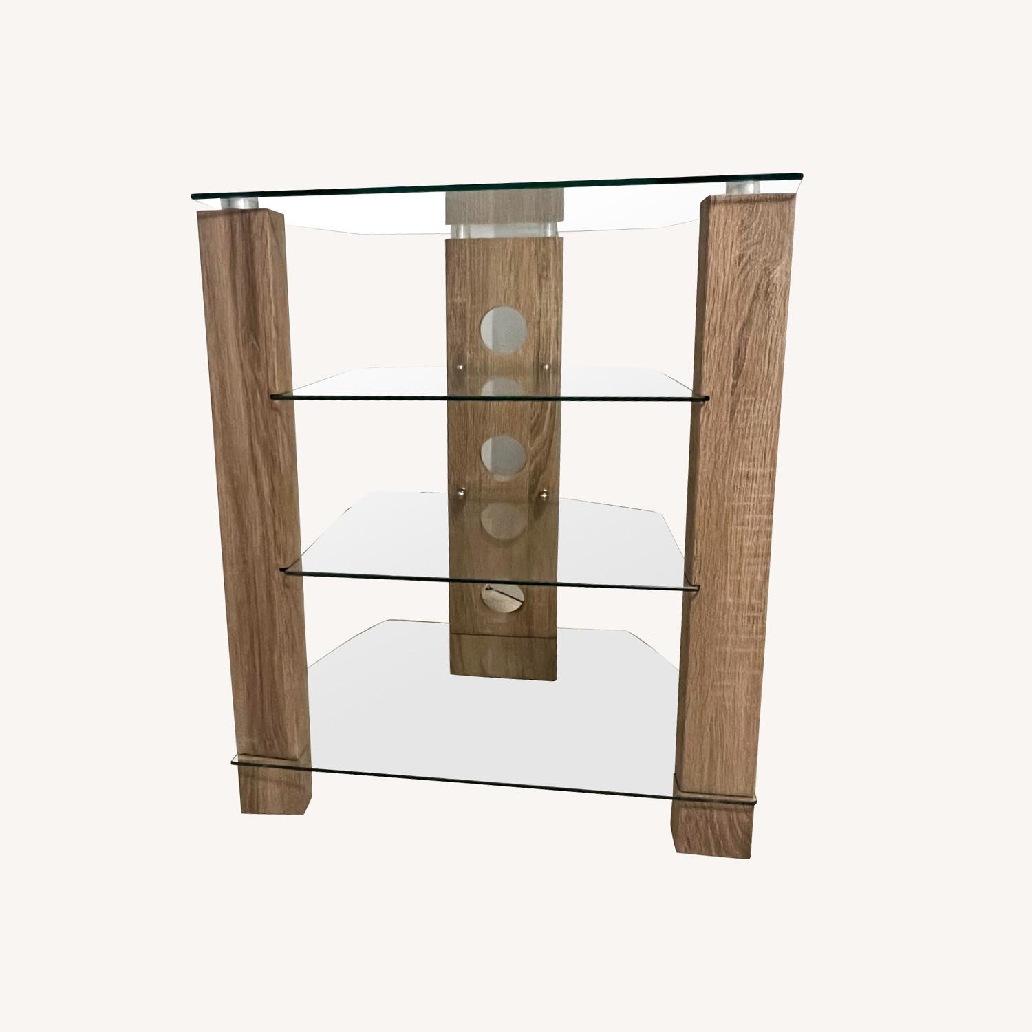 Seller's Notes:Dimensions: Wood media stand size: 23.6(L) x 16.5(W) x 28.3(H) inch. The distance between the front two wooden legs is 16.9 inches. The gaps between the 4 shelves, from top to bottom, are 7.9 inches, 7.5 inches and 9.1 inches. The combination of glass and wood is designed to be modern and suitable for the corner or leftover space. Component Stand: The corner tv stand is made of clear tempered glass shelf with round corners and wood grain MDF legs. Stable architecture for maximize strength and safety. Weight capacity max 88/33/33/33 lbs. for top shelf to the bottom. 4-Tier Stereo Racks: This AV stand has four shelves storage for audio video component equipment, Xbox One, Gaming Consoles, sound bar, woofer, DVD players, AV receiver, Blu-ray player, PS4, cable boxes, amplifiers, speakers, record player, etc. The Top Shelf also can support Plasma/LCD/LED flat TVs. Cable Management: No need to see those wires anymore! This hifi stand comes with a cable management system in the back to hide the wires without going through the wall and making holes and or hiring an electrician to do it. Condition: In very good condition, only 1 year old and minor blemish near the edge of the glass shelving where it meets the wooden slot mount. Blemishes are unnoticeable.