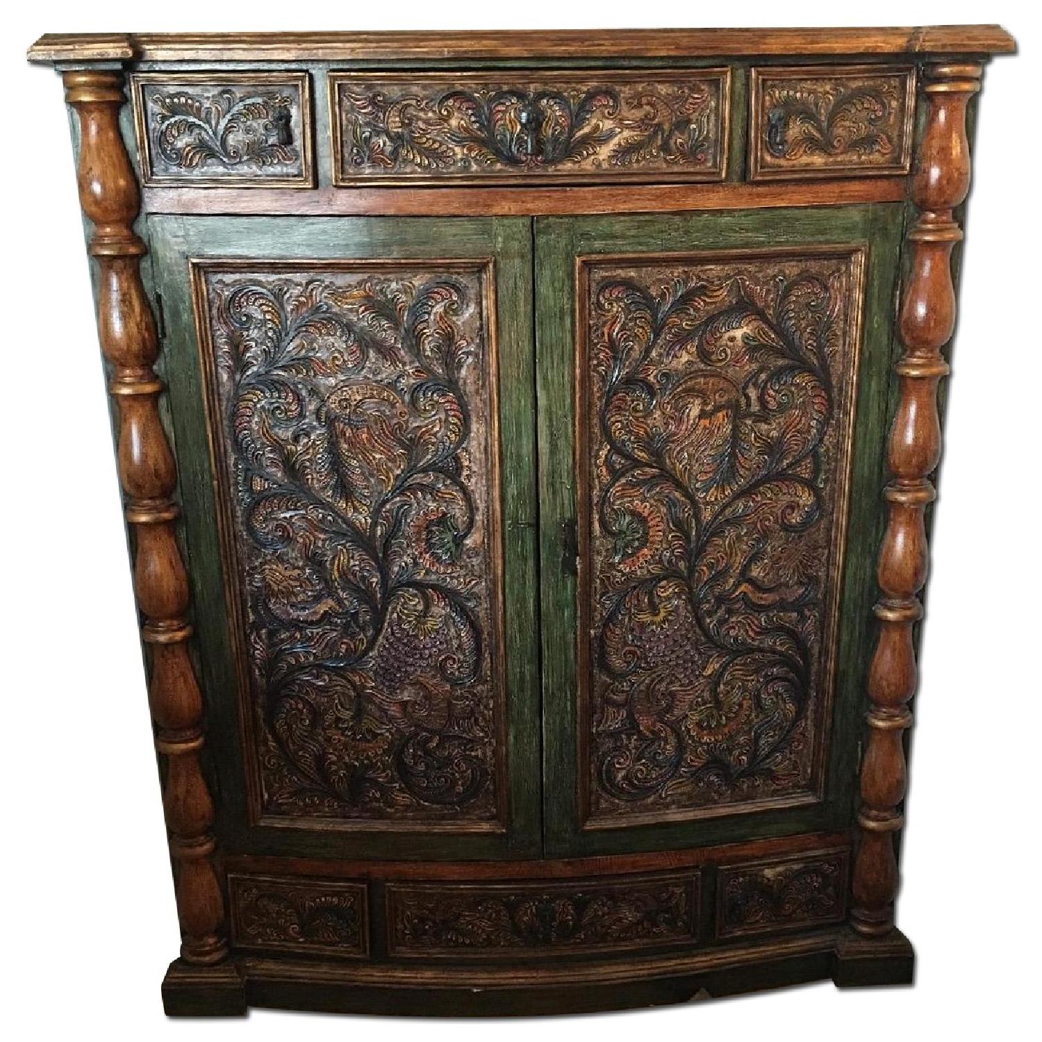 Seller's Notes:This is a one of a kind corner teak corner cabinet. The front of the cabinet has several ornate carvings and is very unique and beautiful. It has been used as storage for clothing or makes a great liquor cabinet. The cabinet easily slides into any corner.