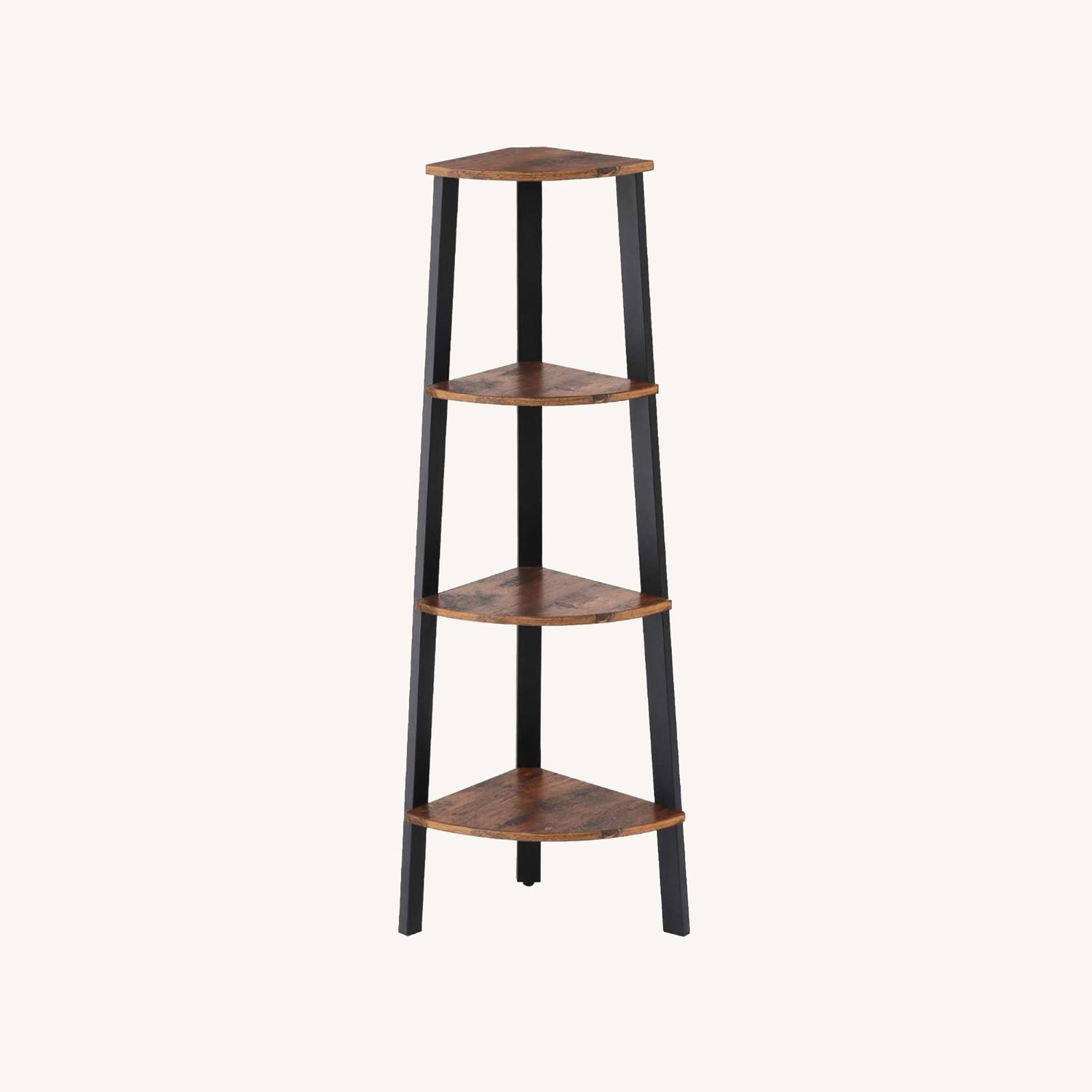 Seller's Notes:I’m renovating and need to let this go but it’s a great Corner Shelf, 4-Tier Bookcase, Storage Rack, Plant Stand for Home Office, Wood Look Accent Furniture with Metal Frame, Rustic Brown. Vintage industrial style.