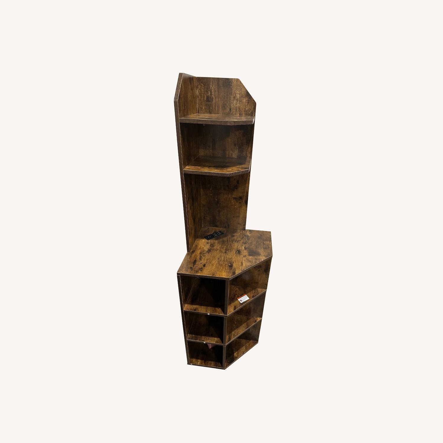 Seller's Notes:Corner shelf with charging station. Color: rustic brown. Completely new, only built but didn’t match the dining set. Never used. 63.4” height, 18.5” depth.