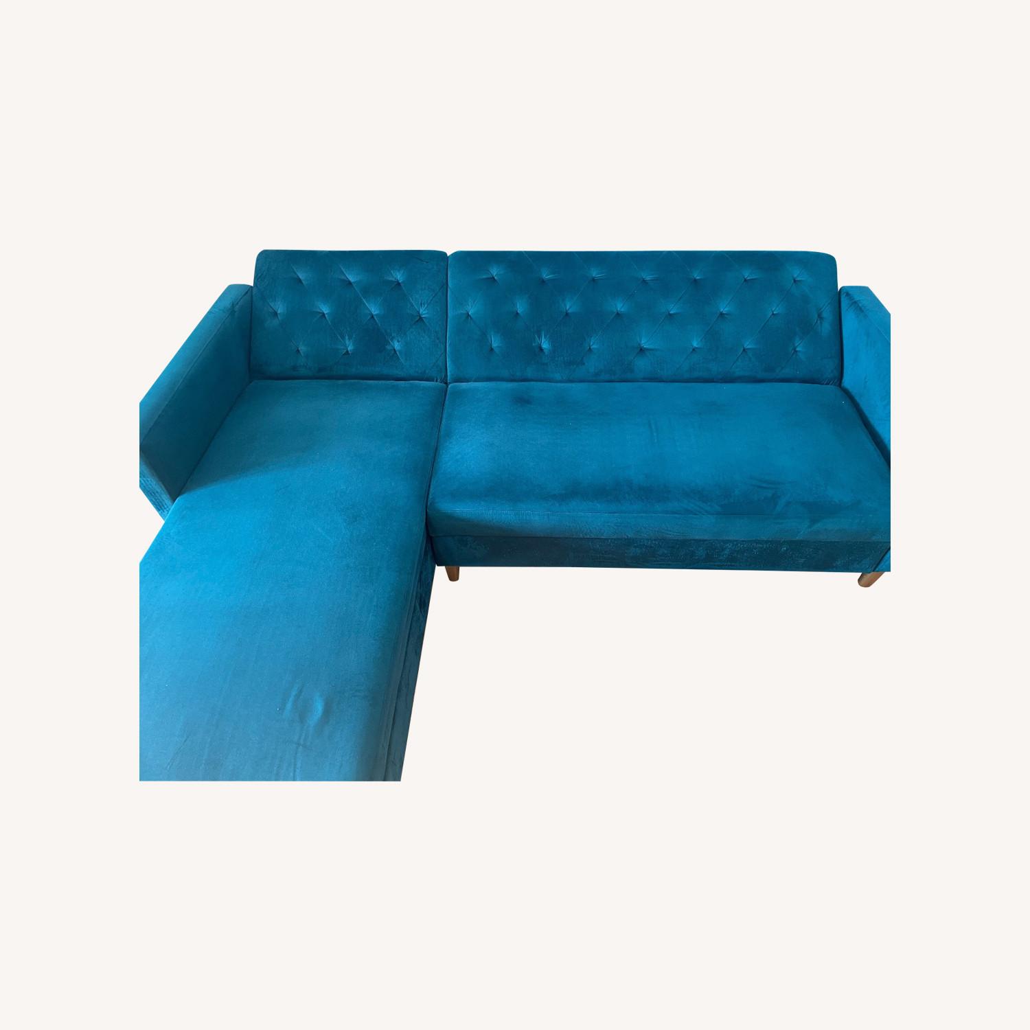 Seller's Notes:This simple and stylish teal velvet 2 piece sectional has been pre-loved for 3 years and still functions and looks like new. There are a few nicks & scratches on the feet of the couch from hitting it during vacuuming they are unnoticeable but can be covered with gold paint. Slight discolorations on the corners of the couch due to normal wear & cleaning. The chaise can be configured to set up on either side of the futon and the wide storage compartment is perfect to hold off-season clothing. The adjustable back allows you to recline or lie flat for the best night's sleep you ever had. Tan couch cover also included with order Dimensions Sofa 32.5'' H X 51'' W X 33'' D Back Cushion 18.5'' H Overall 32.5'' H X 84'' W X 60.5'' D Storage 23'' X 5'' Chaise 32.5'' H X 23.5'' W X 60.5'' D Sleeper Sectional 76.5'' W X 41.5'' D Seat Depth - Front to Back 23'' D Overall Product Weight 136.5 lb. Seat Height - Floor to Seat 17'' H Storage/Compartment Depth - Front to Back 58'' Arm Height - Floor to Arm 24'' H Leg Height - Top to Bottom 5'' H Minimum Door Width - Side to Side 14'' W
