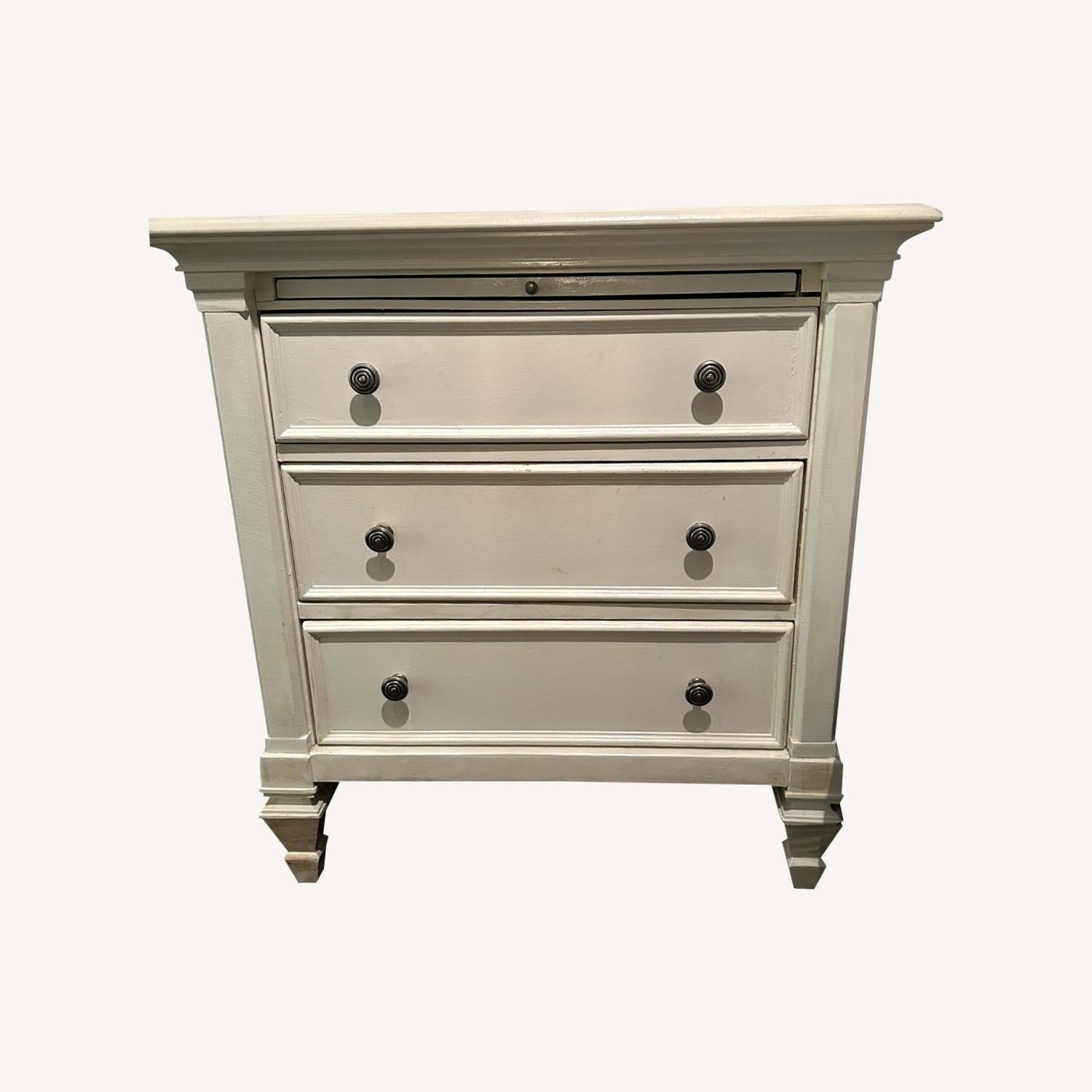 Seller's Notes:***matching large dresser listed separately! From Fortunoff, purchased in the early 2000s as part of a set. I've had this nightstand for years and it's finally time for it to find a new home! Specs: 30 inches wide 16 3/4 inches deep 32 inches tall 3 drawers Hidden extension for extra surface area! Gorgeous solid wood nightstand with three drawers and a hidden table extension. Such a great piece of furniture that I have loved owning. It's got so much storage (even with the top drawer being slightly less deep than the bottom two). And, lots of surface area on the top table. The extra extension is great for placing a glass of water or a laptop if you're watching TV at night. I recently sanded and re-painted the set, but there are areas where it could use touch-ups. You could also choose to repaint the entire thing. Part of a matching set with a beautiful dresser with a large mirror, listed separately. I hope you love it as much as I have!