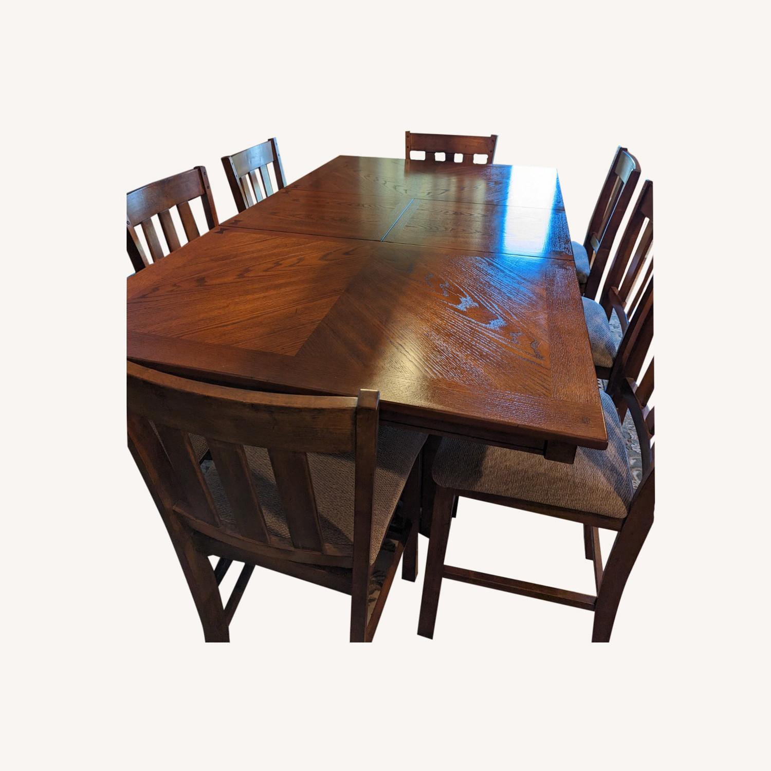 Seller's Notes:This is a counter height dining room table with 8 matching chairs. The table is in excellent condition with just some light scratches. The table has a butterfly leaf in the middle that folds into the table when you aren't using them taking it from 72 inches to 54 inches long. The table is made by Jofran and it is made of wood. The base of the table has a shelf for storage as well as a hinged door for additional storage in the base. This is a great table for any family.