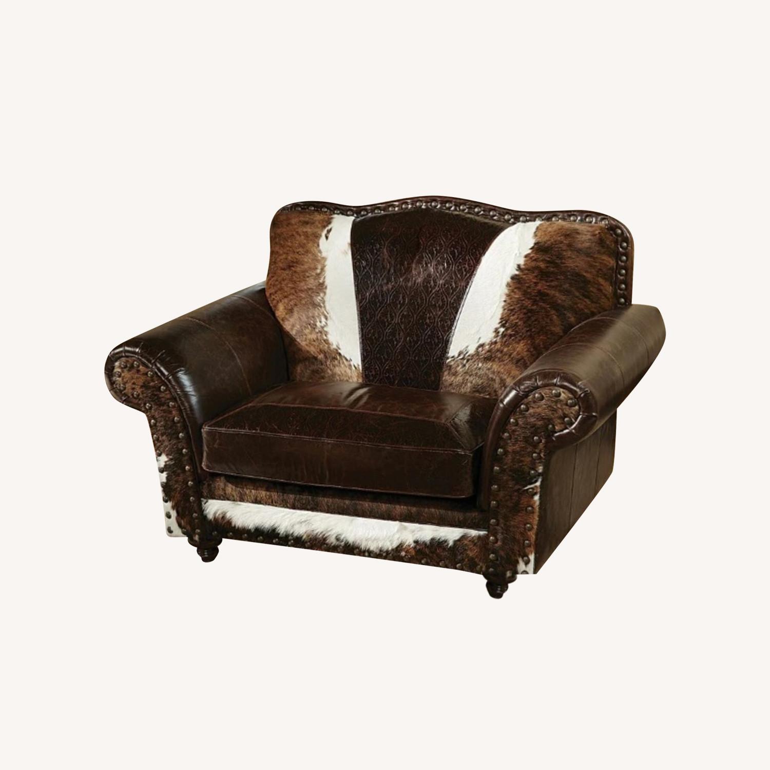 Exclusive Item - Enhance the stylish western mood of your living room with the Cowtown Chair and a Half, finely crafted with dark brindle Brazilian cowhide on the in-back, seat rail and panels, an embossed Triumph pattern "V" insert and window frame seat, and brown buffalo leather body with topstitching and antiqued brass nailheads.