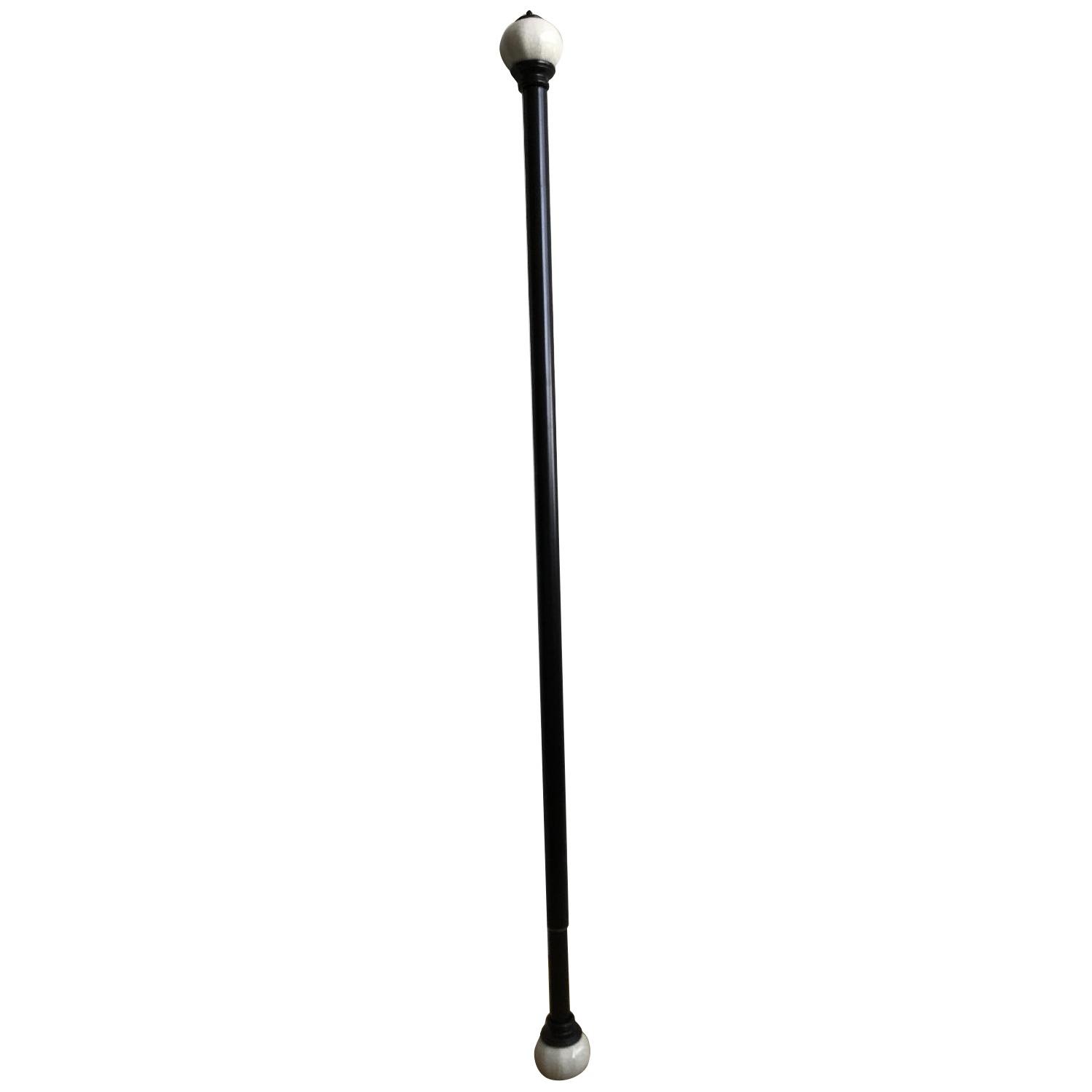 Seller's Notes:Antique bronzed finished metal curtain rod with ceramic crackled finials. 40”-66” length. One finial is cracked but can be placed to face wall the way one of the finial shots show.