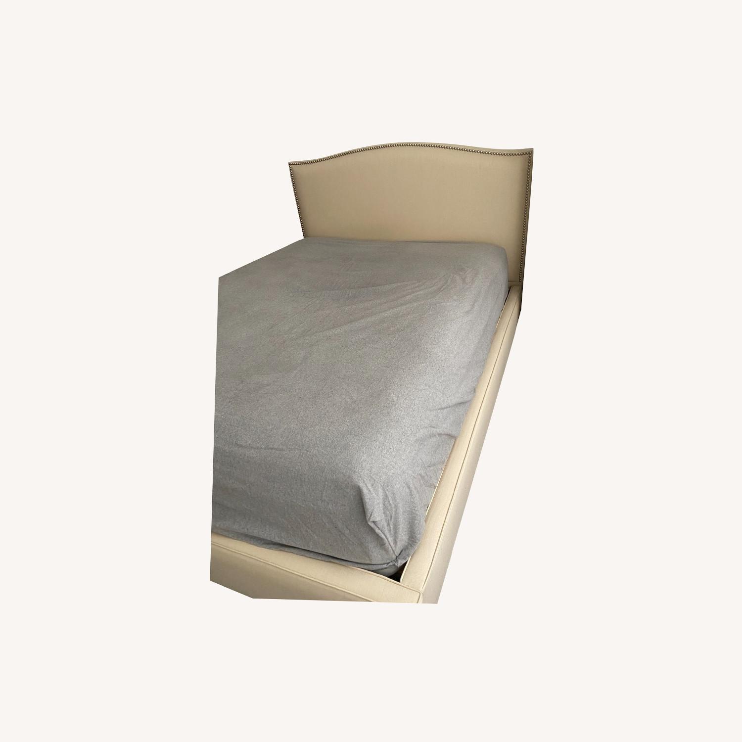 Seller's Notes:The Colette king bed's understated curved camelback in a soft natural linen blend brings grace and sophistication to the bedroom. The platform bed's headboard is outlined in signature brushed pewter nailheads that are individually hand-applied, while curved, solid maple legs in a black finish add substantial presence. Plus, the headboard is fully upholstered front and back to give you more flexibility in setting up the bedroom you desire. The Colette Queen Bed is a Crate and Barrel Exclusive. I've owned the bed for approx. 8 years and it's in great condition, except for a tear in the fabric during a move.