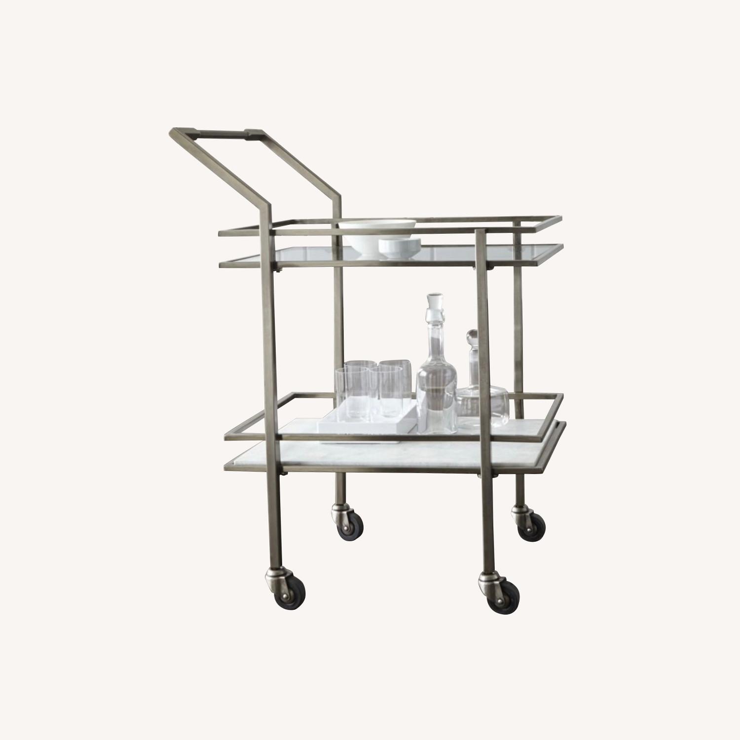 Seller's Notes:Crate and Barrel Renee Bar Cart. Used, but like new. Unblemished. Steel frame with a silvery pewter finish, a glass top shelf and white marble bottom shelf.