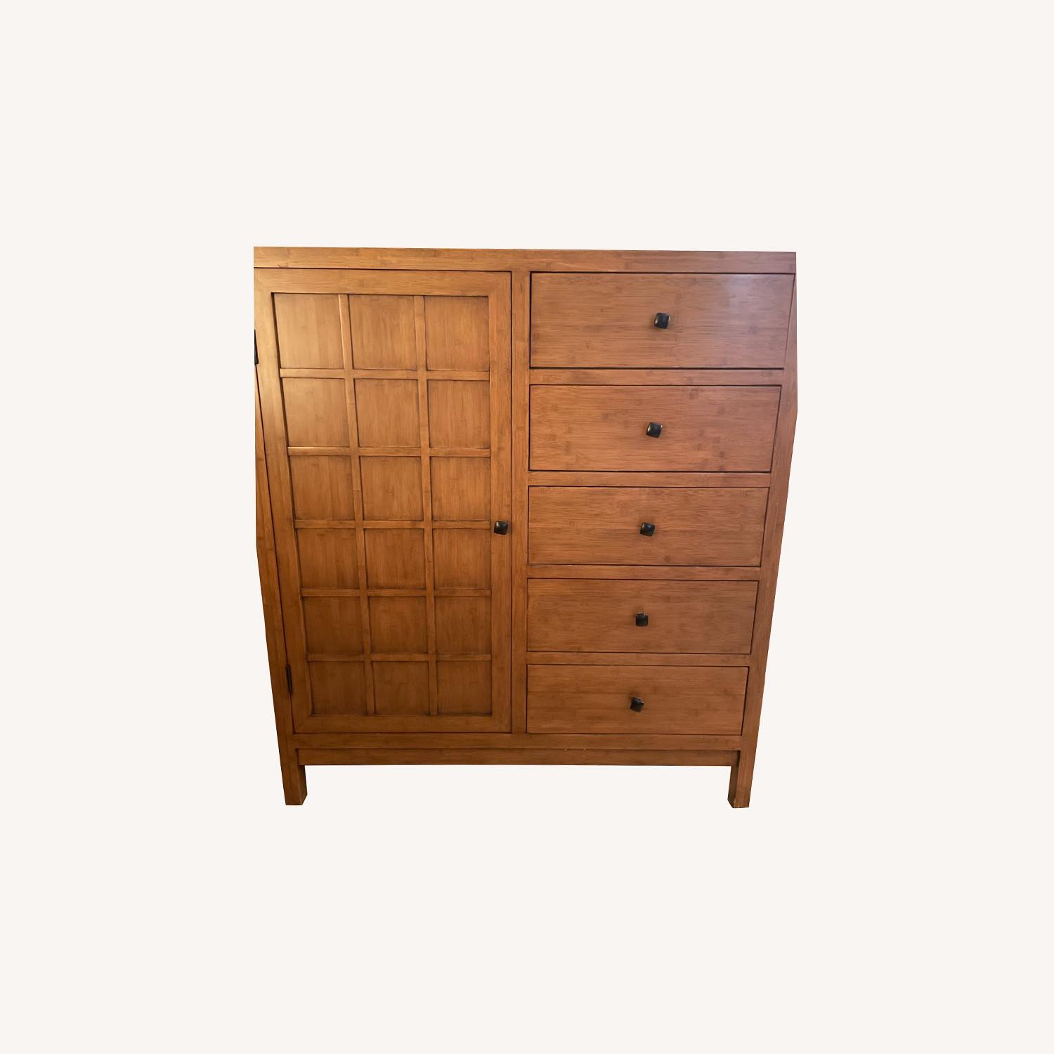 Seller's Notes:Crate and barrel, storage, wardrobe, dresser. Beautiful solid piece of furniture. 5 drawers plus a hinged door that has shelving or hanging space. The only blemishes are on the top of the wardrobe which can be covered by a place mat or runner. Every other part of the piece is in beautiful condition.