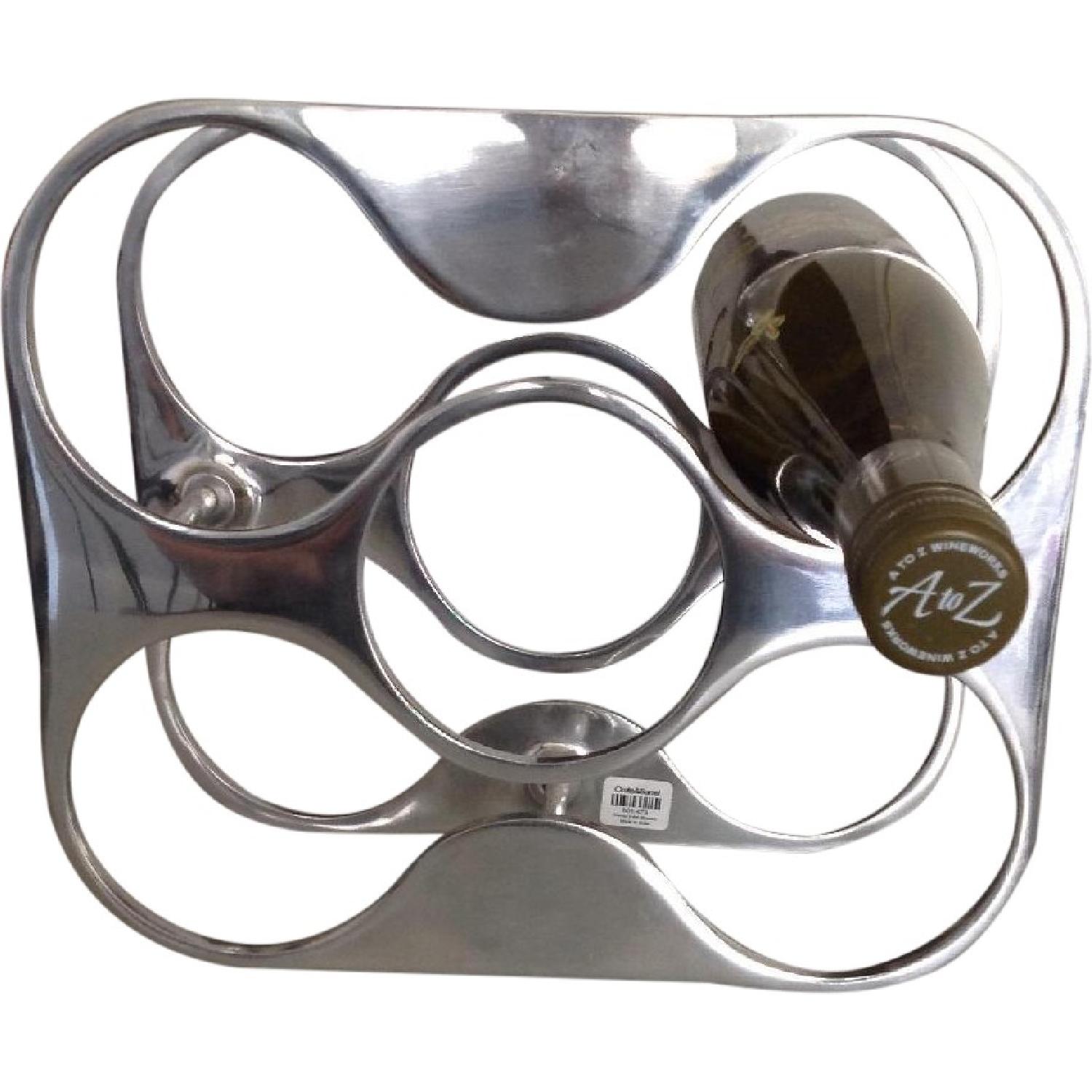 Seller's Notes:Sleek polished silver tone metal winerack. Due to the nature of the finish the winerack picks up hand prints and smudges easily. But it's versatile and works with most decors. It can be used decoratively on a counter or as storage inside a cabinet. Make an offer.