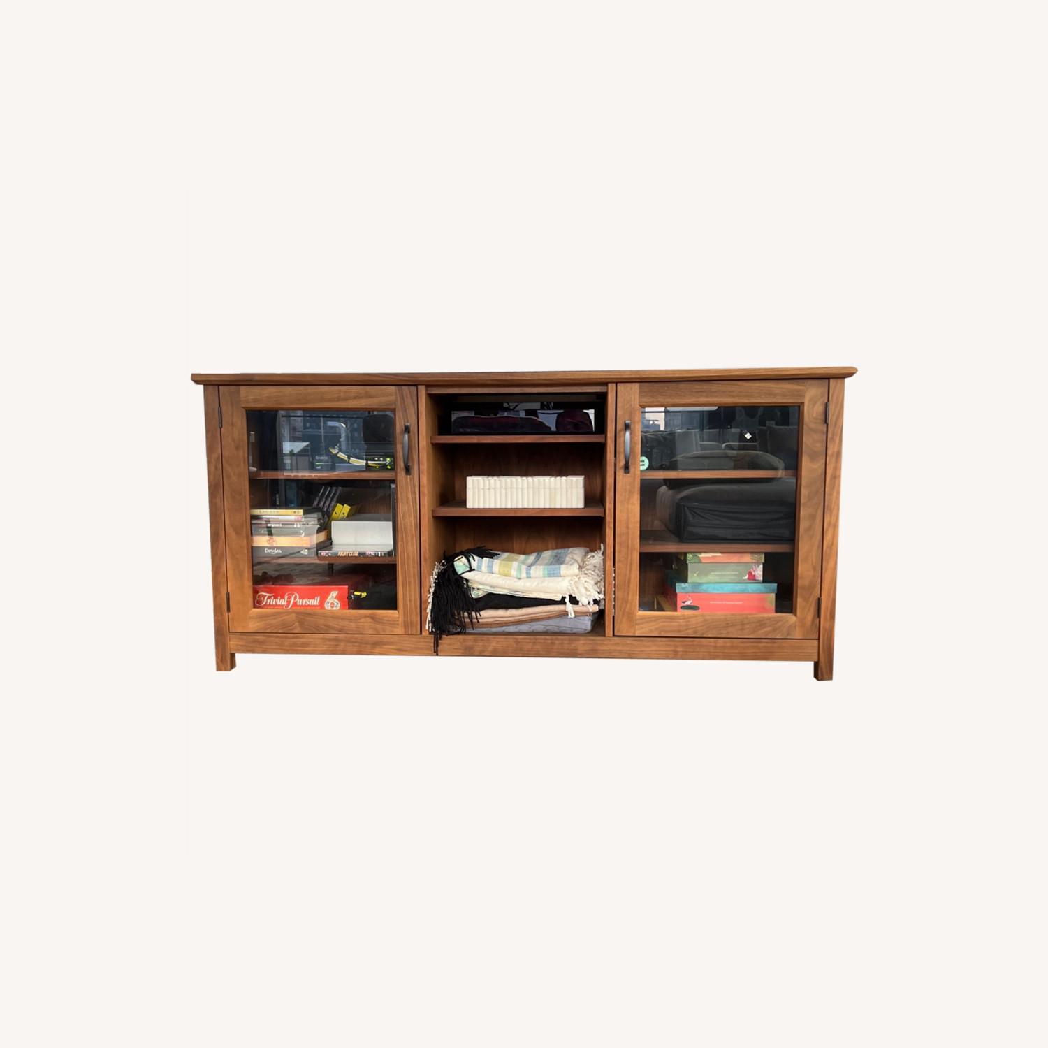 Seller's Notes:With interchangeable door panels in glass or solid wood, Ainsworth takes a versatile approach to storage with a clean design that shows off the distinctive beauty of walnut. With your choice of glass or wood doors to flank the center open storage space, this versatile media console easily transitions to a sideboard or credenza. Cutouts provide plenty of cord management for media components. Stocked with dark antiqued finished pulls, the media console can also be fitted with coordinating wood pulls. The Ainsworth Walnut 64" Media Console with Glass/Wood Doors is a Crate & Barrel exclusive. Ainsworth Walnut 64" Media Console with Glass/Wood Doors. 64"Wx19.5"Dx30.25"H Solid walnut, walnut veneer and engineered wood Natural oil and wax finish Dark antiqued finished door pulls Includes both wood and glass door panels 6 adjustable shelves Cord management cutouts