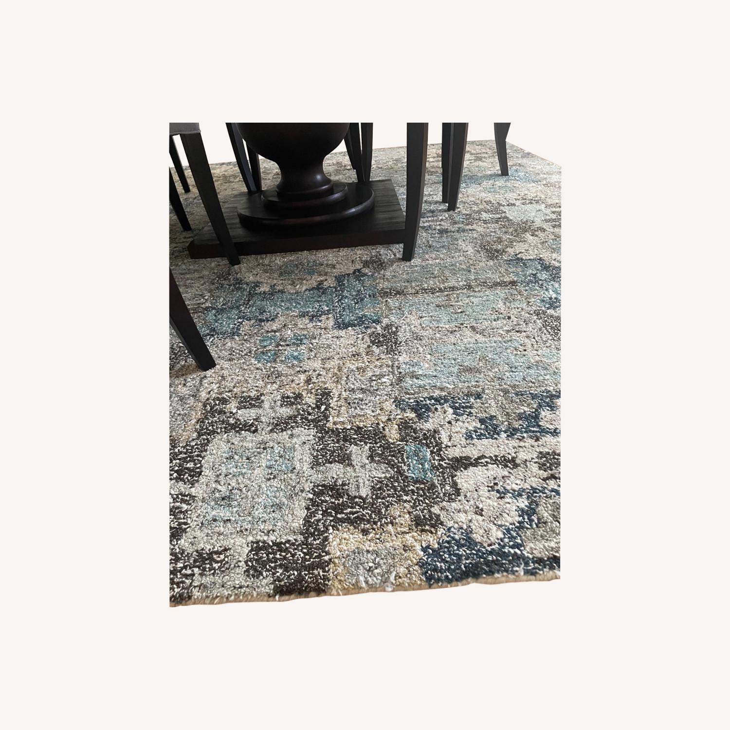 Seller's Notes:Crate & Barrel Alvarez 8x10 area rug in color “Mineral Blue” wool blend. Contemporary pattern with warm gray, subtle blues, dark brown, and other neutral tones. Few minor pulls but barely used and in very good condition. ~NCI