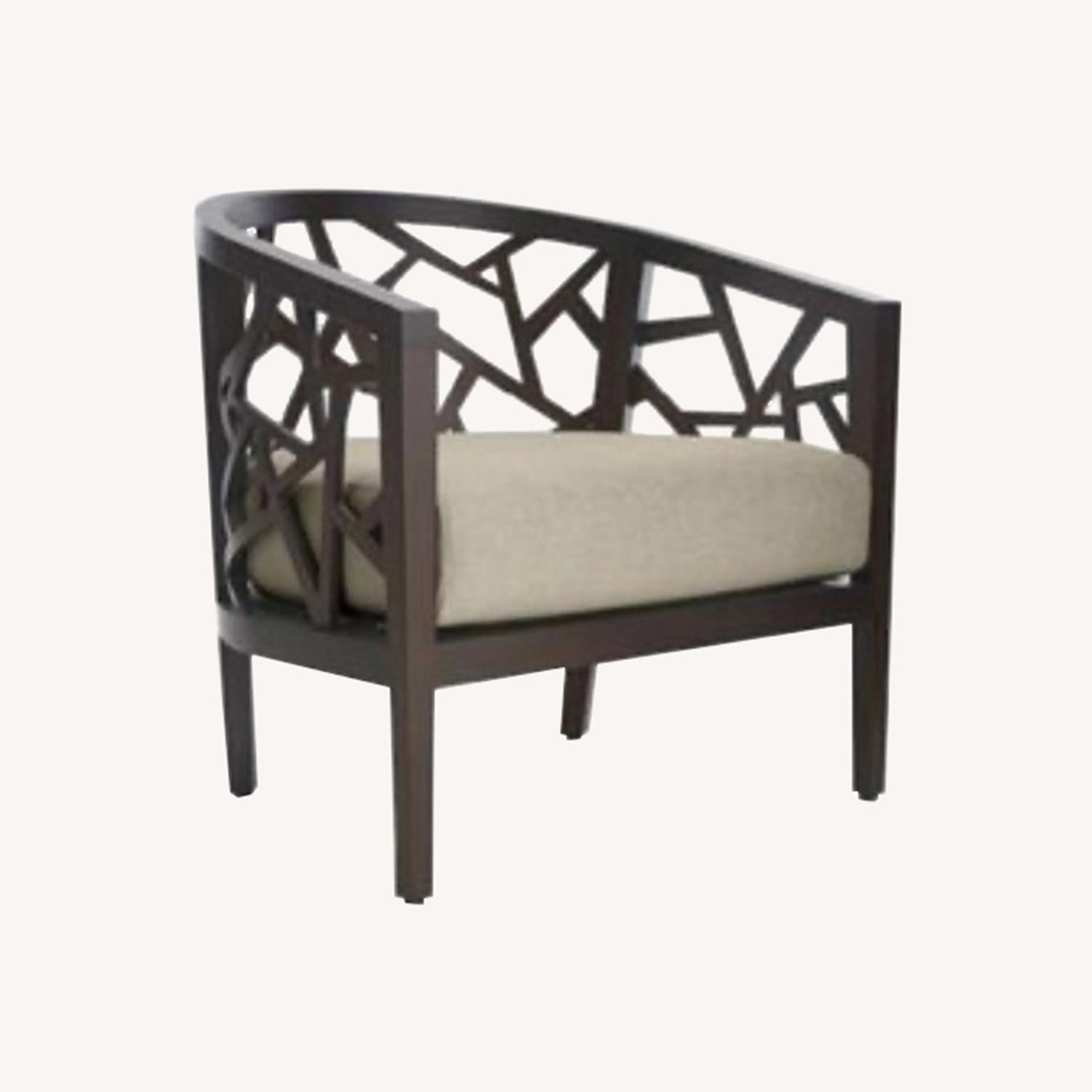The chair's geometric barrel design is inspired by Indonesian mosaics and handcrafted of solid mahogany and mahogany-veneered hardwood with beautiful precision by the islands' skilled artisans. A handwoven tropical cane seat hosts a comfortable thick cushion upholstered in a heavyweight blend of rayon, flax and cotton that yields slight luster and a pleasing slubby effect. Also available with a leather cushion. Ankara Chair is a Crate and Barrel exclusive.