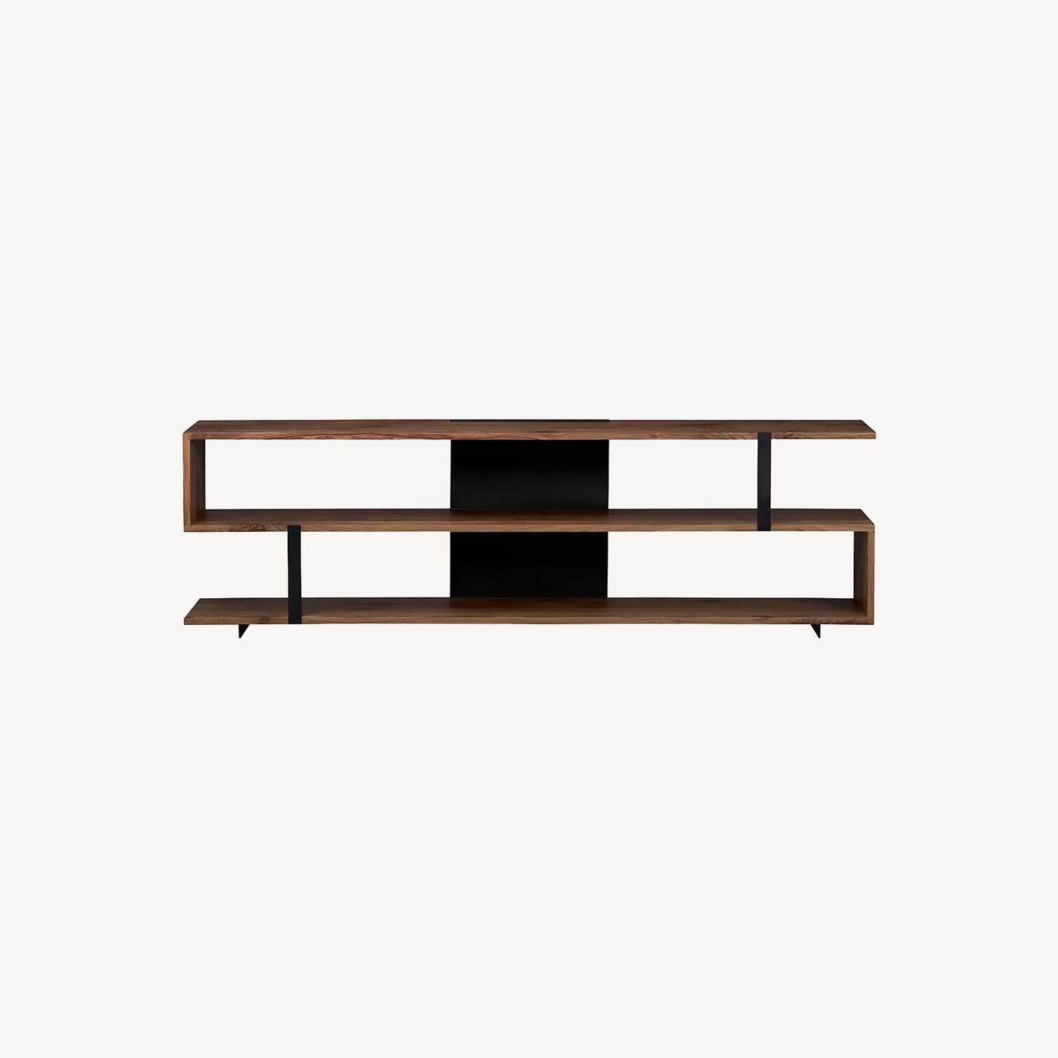 Seller's Notes:Solid walnut zigs and zags as an open, architectural console accented with matte black steel supports and dovetail joinery. As practical as it is sculptural, Austin adds style points as a media center, low bookcase, or floating room divider. Measuring 78 inches long, this dramatic console provides plenty of room to store and display. A solid, high-quality furniture piece that looks new, it has no scratches, but the wood has lost some of its original color (it slightly lightened some areas) due to the light that shed on the furniture, as we live in an all-glass apartment. Description • Solid walnut with sealer and clear lacquer topcoat • Steel posts and legs with matte black finish • Dovetail joinery Overall Dimensions Width: 78.75" Depth: 14" Height: 24.5"
