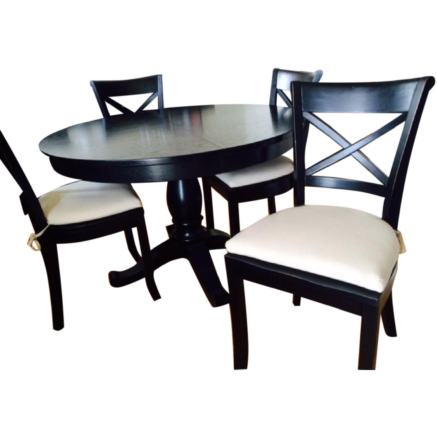 Seller's Notes:Avalon Black Extension Dining Table w 17 inch leaf extension. The dining table's deeply recessed apron and easy-glide mechanism allows four guests to sit comfortably in the round, and up to six with the 17" leaf. • Oak veneer, engineered wood and solid wood base Height: 29.5" Diameter: 45" With 17" Leaf Width: 62" Depth: 45" (4) Vintner Black Side Chair with Seat Covers This classic side chair is crafted of solid wood with a painted black finish that's hand-rubbed at the edges for a lived-in look. • Sustainable solid rubberwood Width: 17.5" Depth: 19.25" Height: 35.5"