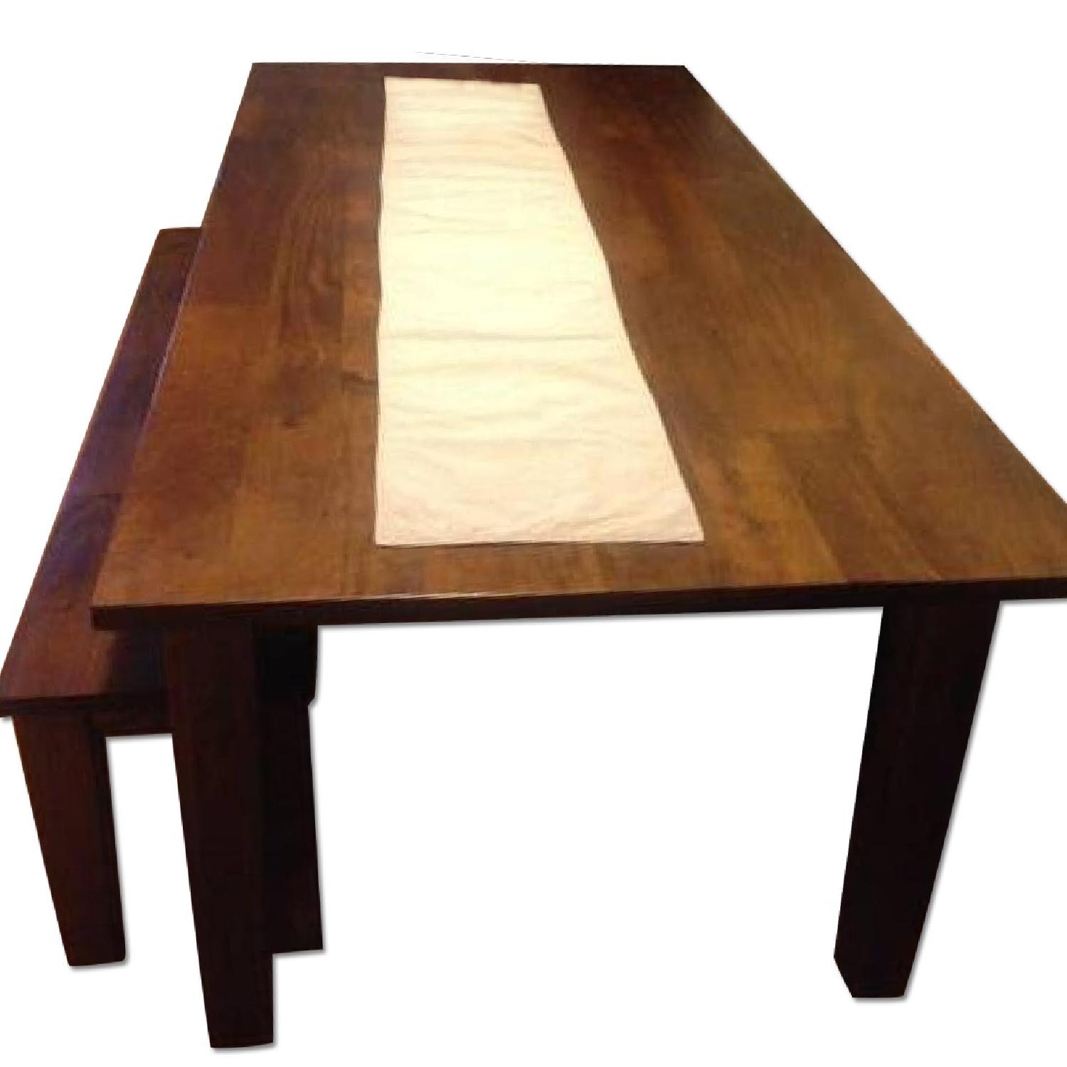 Seller's Notes:Basque Honey 82" Dining Table Hand-hewn in oversized proportions, this 82" table has the heft and character of a European farmhouse antique. The simple, rustic design has substantial legs and a hand-planed plank top with authentic peg detailing. Open grain and knots are unique to each piece. The rich honey finish is waxed to a soft sheen. http://www.crateandbarrel.com/basque-honey-82-dining-table/s180378 Basque Honey 82" Dining Table. 82"Wx38"Dx29.5"H Handcrafted Sustainable, kiln-dried solid mango wood Naturally occurring grain and knots Rich honey finish Seats up to eight Made in India Basque Honey 62" Bench Hand-hewn with the heft and character of a European farmhouse antique, this simple, rustic bench has substantial legs and a hand-planed plank top with authentic peg detailing. The rich honey finish is waxed to a soft sheen. http://www.crateandbarrel.com/basque-honey-62-bench/s434779 62"Wx14"Dx18"H Handcrafted Sustainable, kiln-dried solid mango wood Naturally occurring grain and knots Rich honey finish 18"H seat