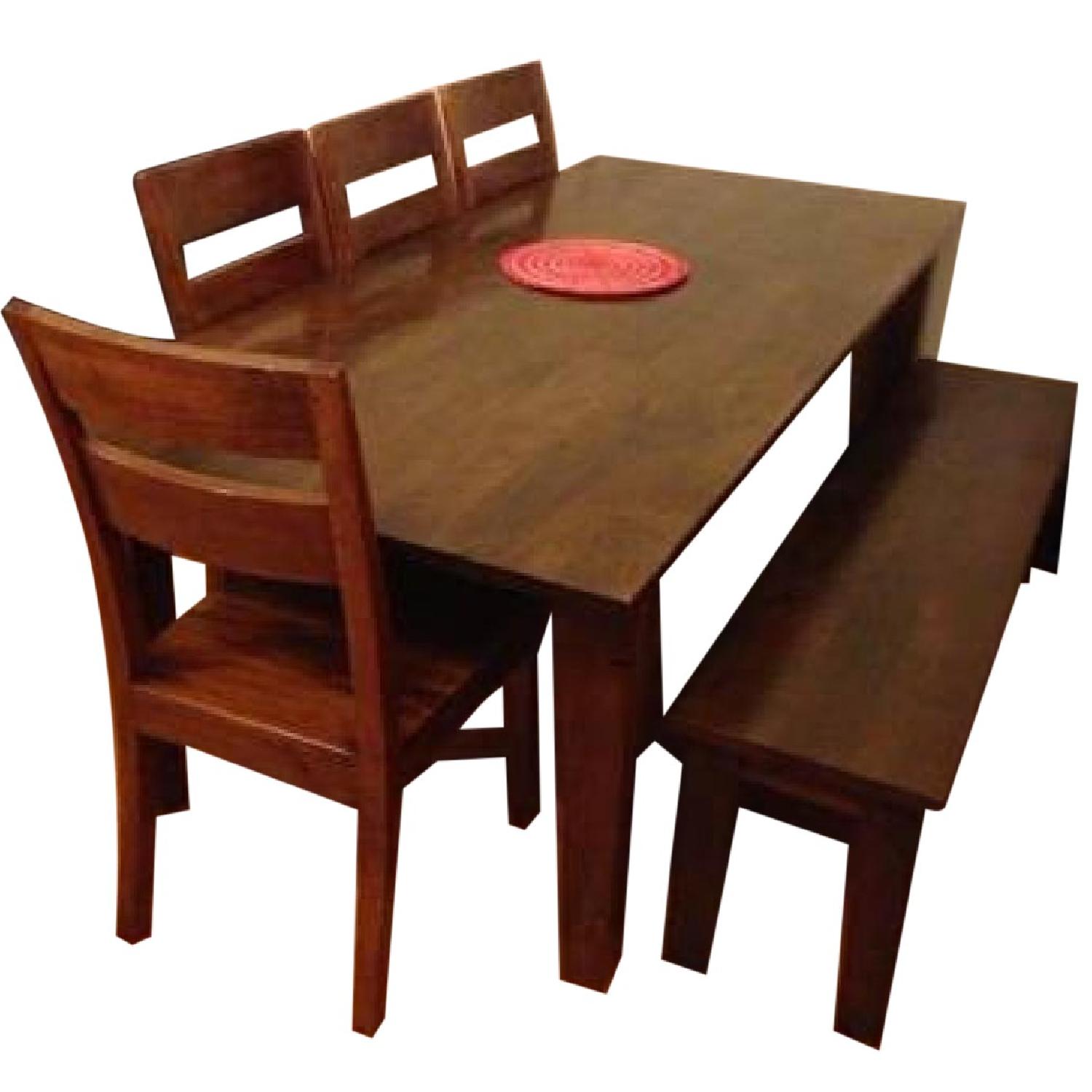 Seller's Notes:Basque Honey 104" Dining Table and four matching chairs. Hand-hewn in oversized proportions, this 104" table has the heft and character of a European farmhouse antique. The simple, rustic design has substantial legs and a hand-planed plank top with authentic peg detailing. Open grain and knots are unique to each piece. The rich honey finish is waxed to a soft sheen. Details and Dimensions Basque Honey 104" Dining Table. 104"Wx47"Dx29.5"H Handcrafted Sustainable, kiln-dried solid mango wood finish Naturally occurring grain and knots Seats up to 10 Made in India