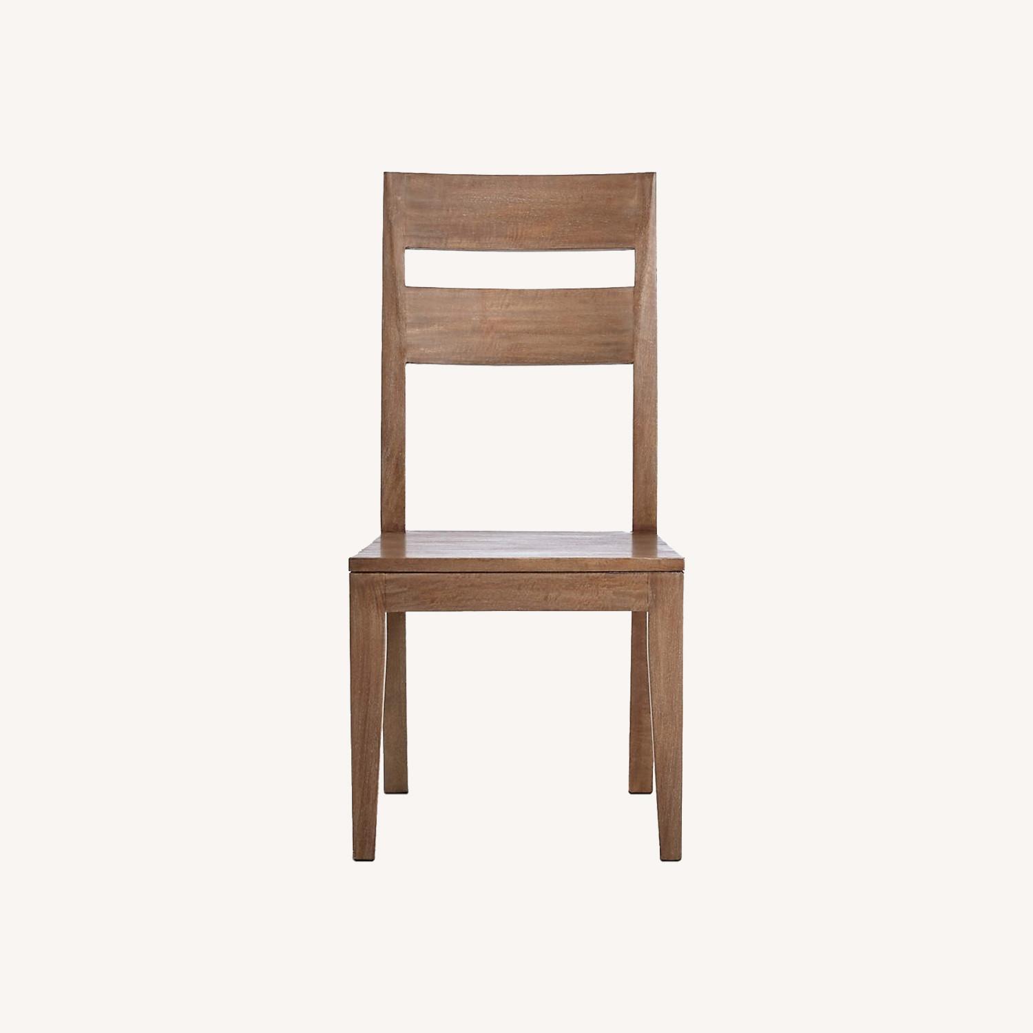 Seller's Notes:Handcrafted of sustainable solid mango wood stained light brown and washed in grey, Basque recalls the heft and character of a European farmhouse antique. Simple and rustic, this chair features a modified double-slat back handcrafted with authentic peg detailing. With generous proportions and a tall back and deep seat, Basque has a strong, yet comfortable presence. The Basque light brown dining chair is a Crate and Barrel exclusive. Basque Light Brown Solid Wood Side Chair 19.25"Wx22.25"Dx39.5"H Sustainable solid mango wood Grey wash over light brown stain with lacquer and wax finish Hand-planed wooden planks Peg detailing Mortise and tenon joinery Naturally occurring grain and knots Made in Indonesia