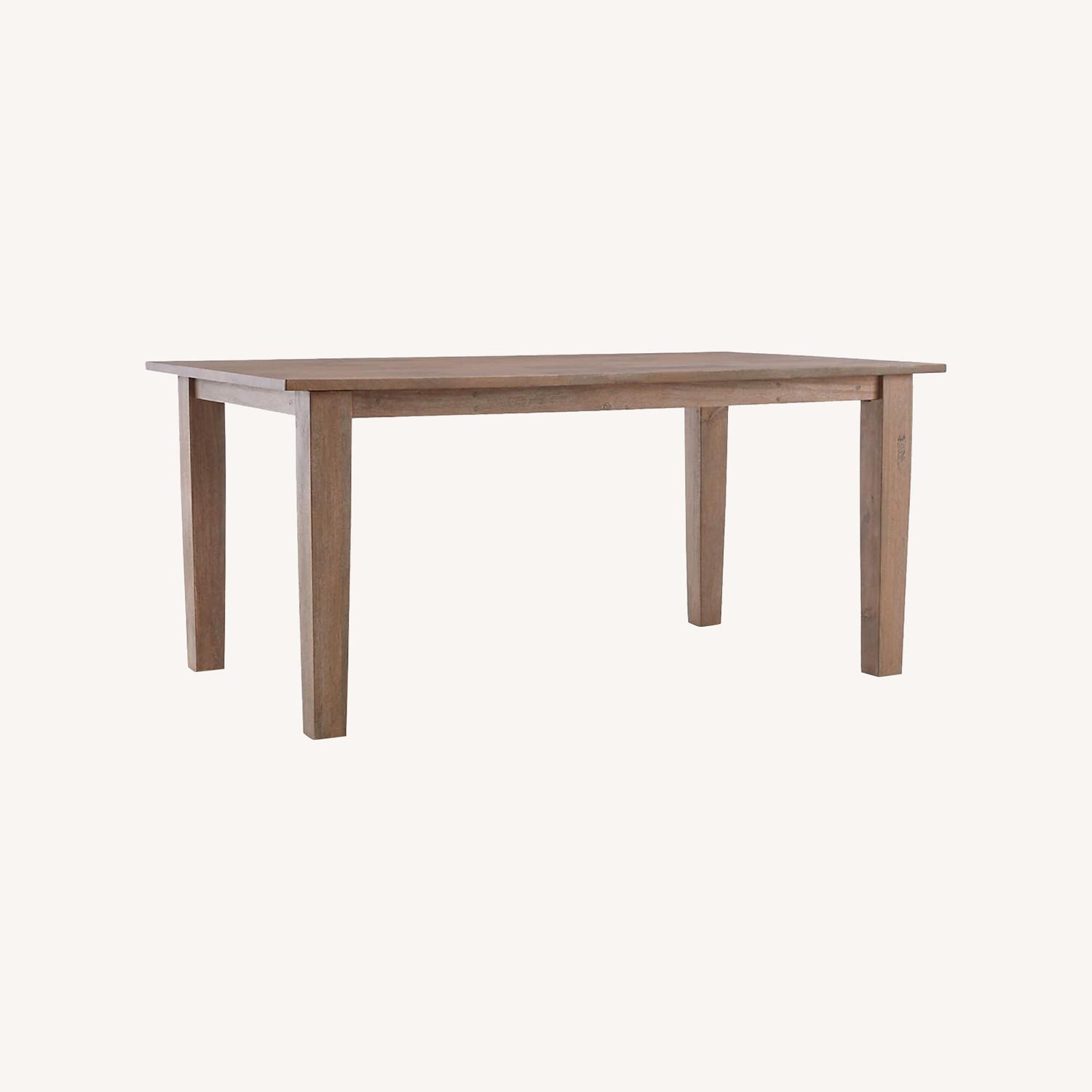 Seller's Notes:Simple and rustic, the Basque dining table displays the heft and character of a European farmhouse antique. With substantial legs and hand-planed wooden planks finished with authentic peg detailing, this moderately scaled six-seat table is handcrafted of sustainable solid mango wood washed with grey over a light brown stain. Each table is waxed to a soft sheen, exhibiting the wood's open grain and naturally occurring knots unique to each plank. The Basque 65" light brown dining table is a Crate & Barrel exclusive. Basque 65" Weathered Light Brown Solid Wood Dining Table 65"Wx38"Dx29.5"H Sustainable solid mango wood Grey wash over light brown stain with lacquer and wax finish Hand-planed wooden planks Peg detailing Naturally occurring grain and knots Learn more about natural wood characteristics Seats 6 Made in Indonesia