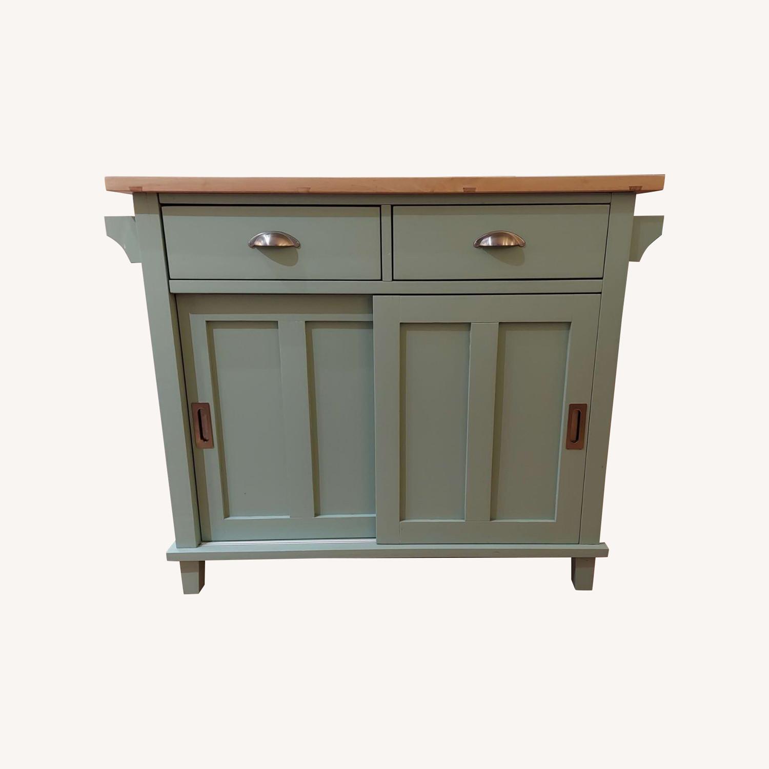 Seller's Notes:Rare mint color kitchen island from Crate & Barrell with an expandable work surface. Thoroughly cleaned and in excellent condition. Comes from a smoke-free and pet-free home. Description from the website: Belmont instantly expands your work surface and storage area as it keeps up with you in the kitchen on sturdy tapered feet. Designed by Bill Eastburn of William Eastburn Design, this contemporary kitchen island with retro styling features a sustainable solid rubberwood top with a foodsafe oil finish and a drop leaf, supported by a base with hidden drawers and shelving. This kitchen island is equipped with 2 deep drawers, a sliding door cabinet with an adjustable shelf, and 2 towel bars. The 4 optional casters (sold separately) make it easy to move or store. With leaf up, accommodates counter stools. The Belmont Kitchen Island is a Crate and Barrel exclusive. Belmont White Kitchen Island 44.25"Wx20.5"Dx36.5"H Designed by Bill Eastburn of William Eastburn Design Sustainable solid rubberwood top with foodsafe oil finish Engineered wood with rubberwood veneer Base painted white with clear lacquer finish Brushed nickel hardware Accommodates counter stools Tapered wood feet Casters (2 locking) available (sold separately) Made in Thailand