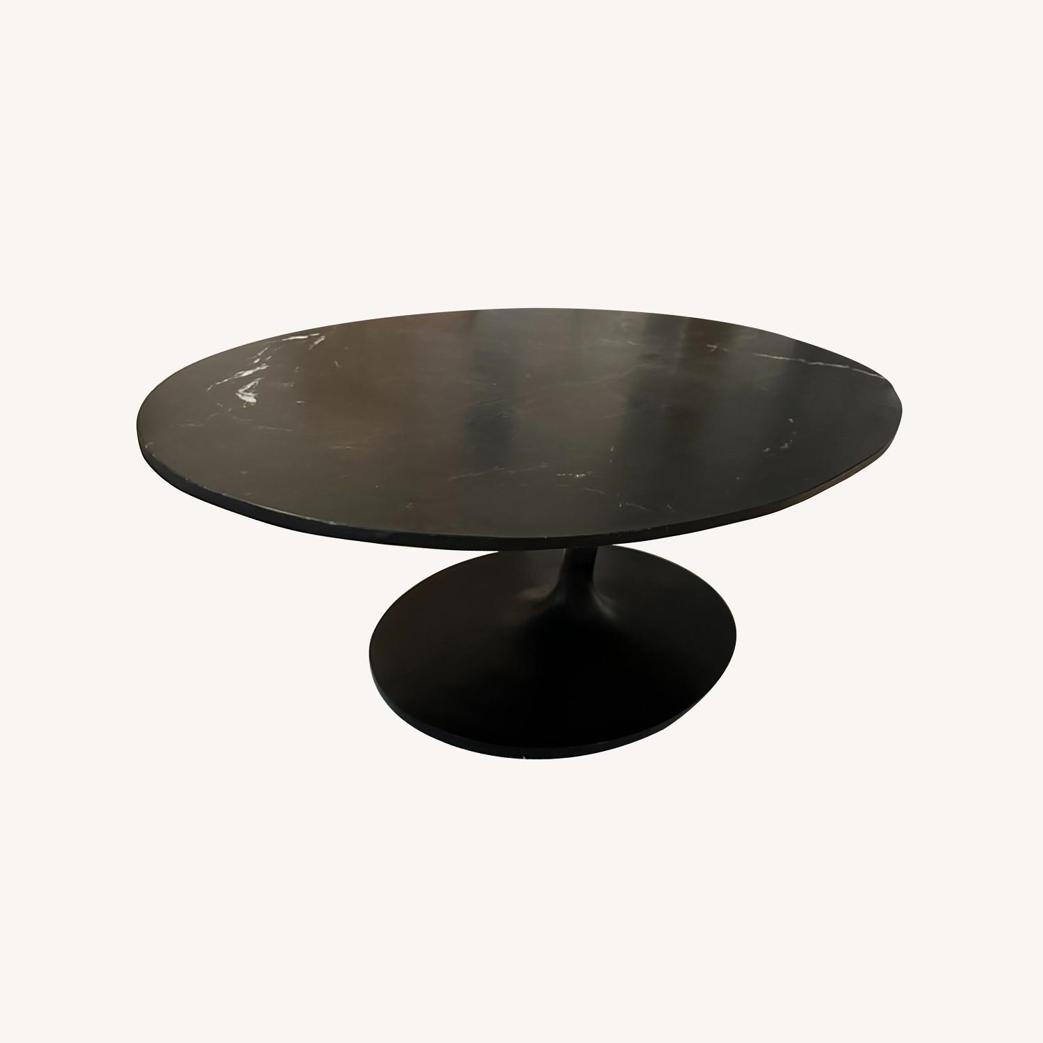 Seller's Notes:Crate & Barrel black marble coffee table. Solid marble top with matte iron base. Oval shape. Slight fading on top center.
