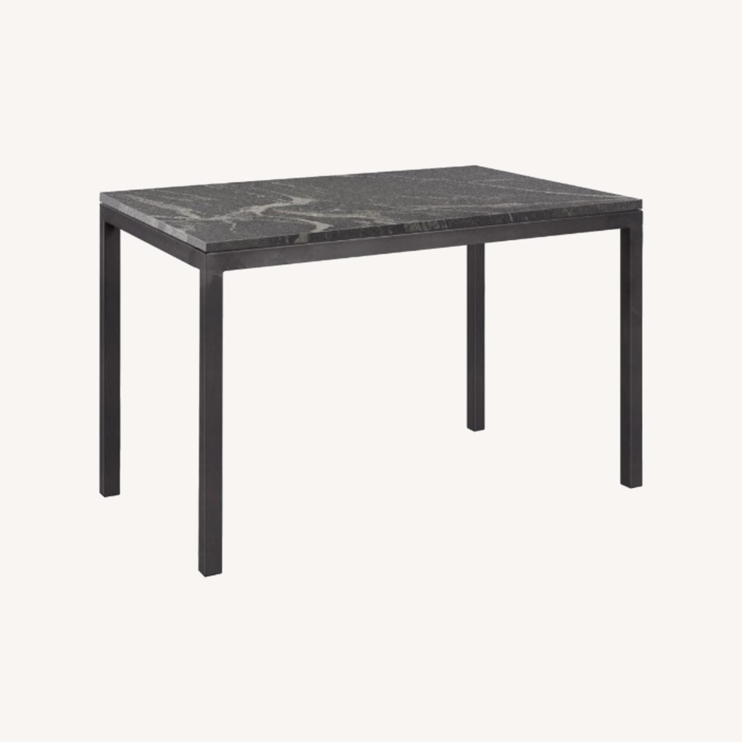 Seller's Notes:TABLE DETAILS: Perfect for kitchens and smaller spaces, this table seats up to 4. The Parsons White Marble Top/ Dark Steel Base 48x28 Dining Table is a Crate and Barrel exclusive. Parsons Black Marble Top/ Dark Steel Base 48x28 Dining Table. 48"Wx28"Dx29.5"H Polished Italian Carrara marble top over honeycomb aluminum core to reduce weight and limit cracking Slight tolerance for fit to base is characteristic of the marble Cut and welded natural dark tubular steel base with torched millscale finish at corners Clear water-based polyurethane finish on base Levelers Foot caps Seats 4 ONLY ONE ITEM AVAILABLE