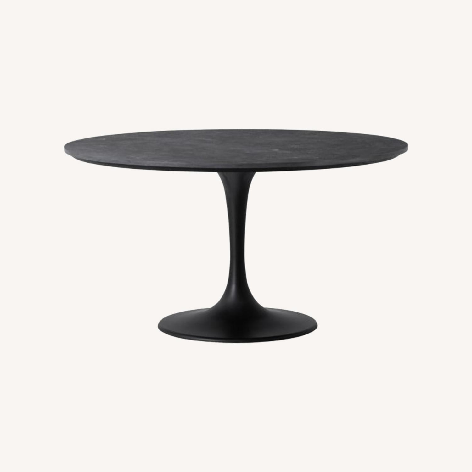 Recast for contemporary dining rooms, the Penn dining table mixes up materials for a natural take on the classic tulip table. A stunning tabletop of bluestone balances on a flared pedestal base made of cast iron with a deep black finish that adds industrial edge. The round pedestal table seats six. Natural bluestone Cast-iron base with rustic black finish Seats 6 Avoid direct exposure to sunlight and heat Imported